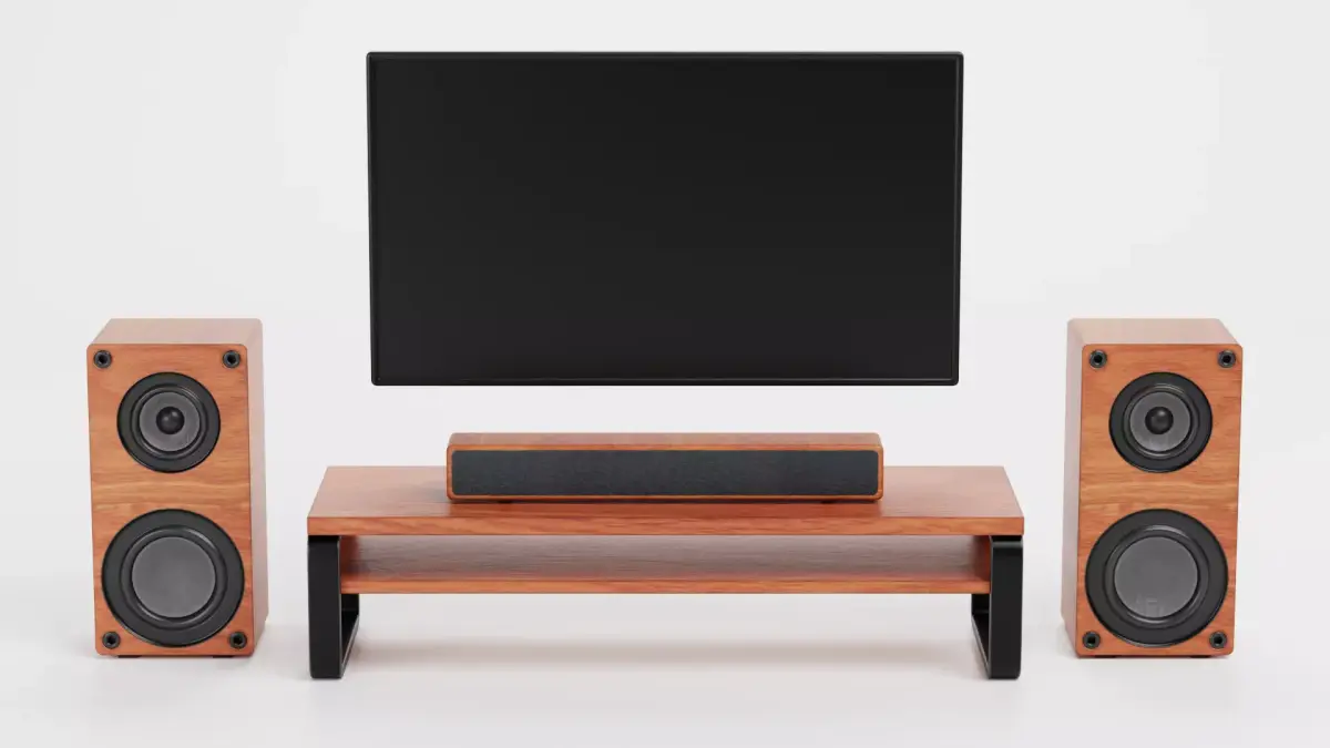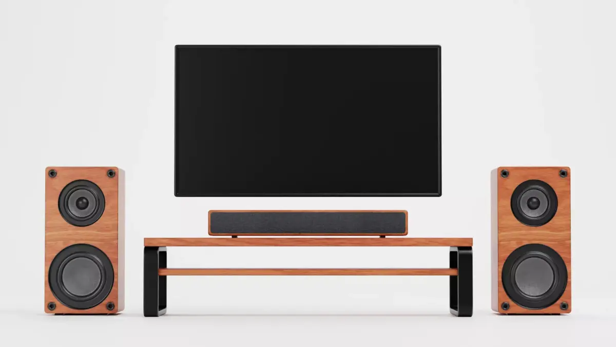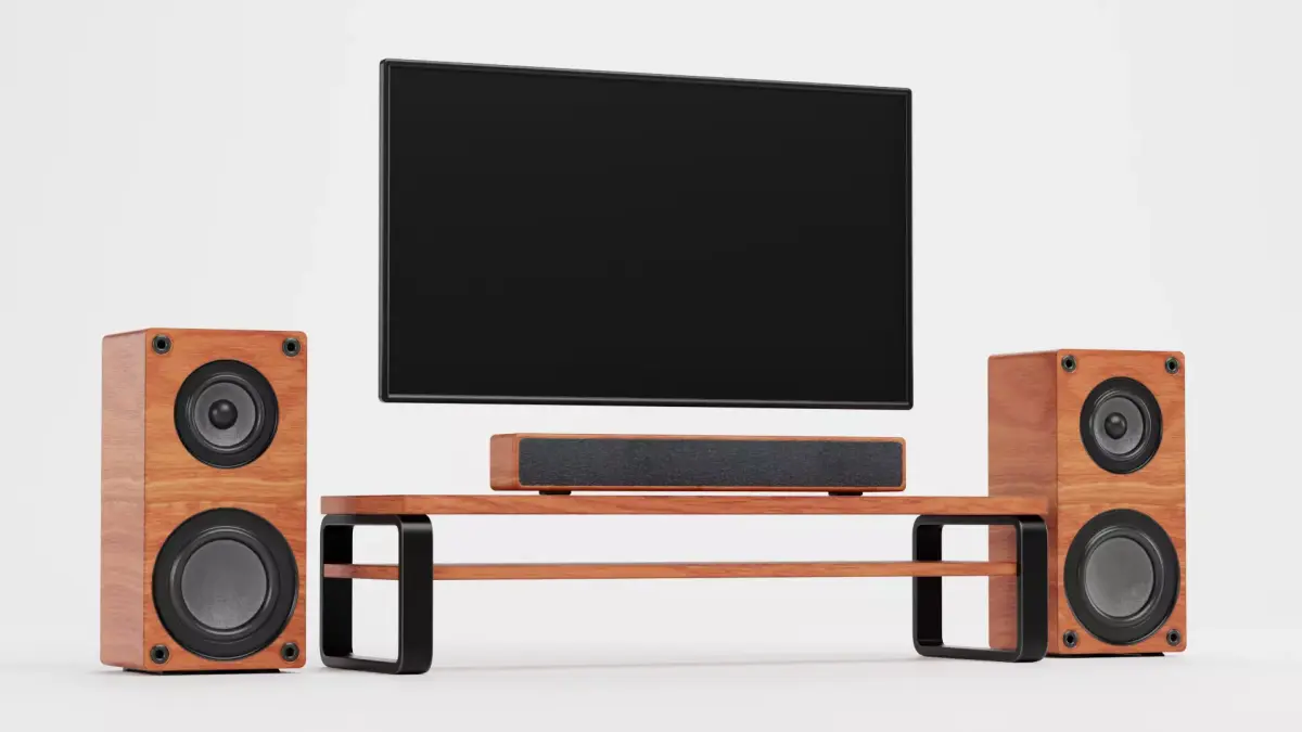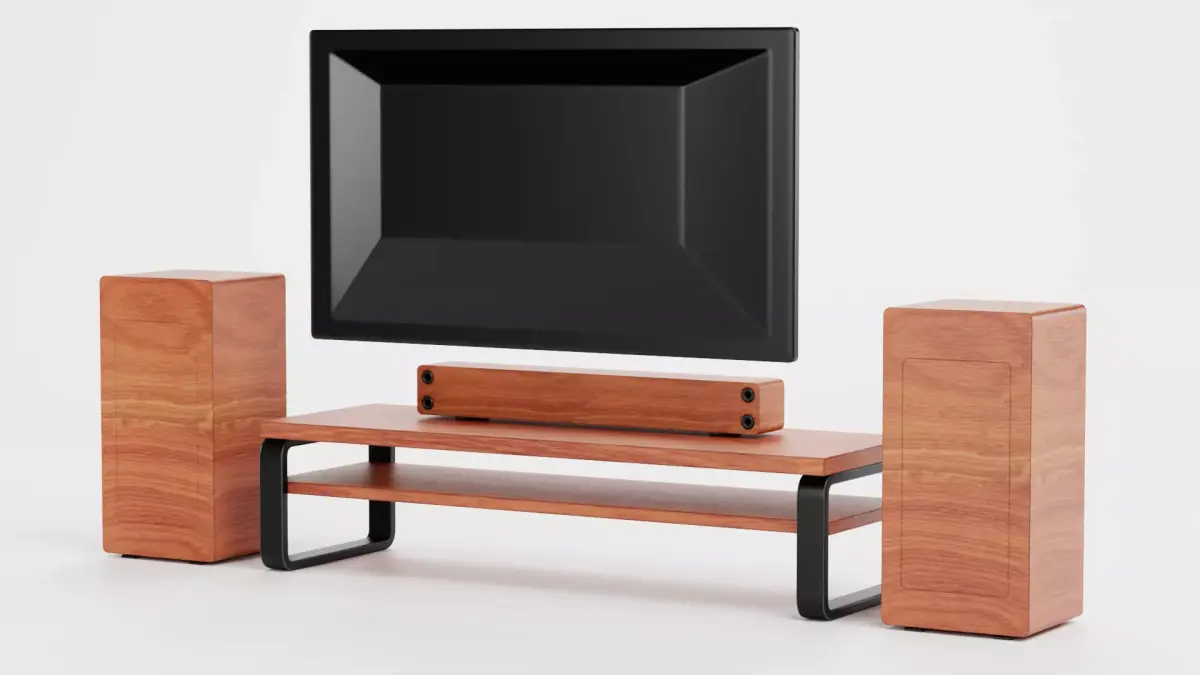 - Modern, no-brand TV set with console, flat screen, soundbar, and tower speakers in wooden decor