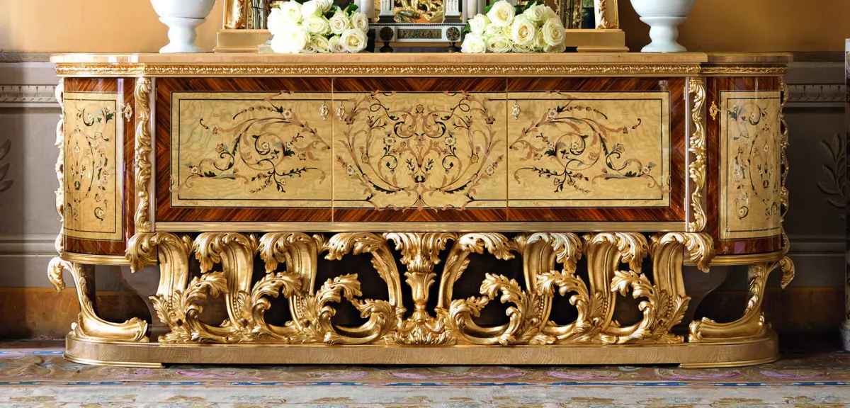 Collection Versailles by Socci revives the opulence and the myth of the Roi Soleil’s Palace by creating a great ambience where time is outstanding among past and present, the material and the sublime, dream and reality. Rosewood, olive ash, maple and birch briar draw a delicate floral inlayed frieze. The different wood essences literally intertwine with each other, like an embrace, as if really a sprig of jasmine rolls up around the frame of the furniture. The golden carved grape leaves are so wide and majestic that seem to extend a blossom to the air. You almost forget that they are the centerpiece of the piece of furniture. Not the usual upholstered sofa. A large curved panel with inlaid decoration wraps the Versailles sofa set (3 or 2 seater and armchair). This is one of the features that distinguish the design of living room by Socci. The same does the delicate pattern drawn by the grinding of glass on the display cabinet, embellished with spherical buttons in polished gold which are applied by hand one by one. Versailles. A neverending elegance.