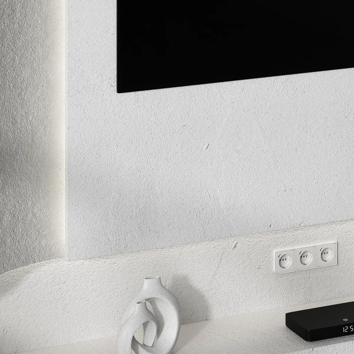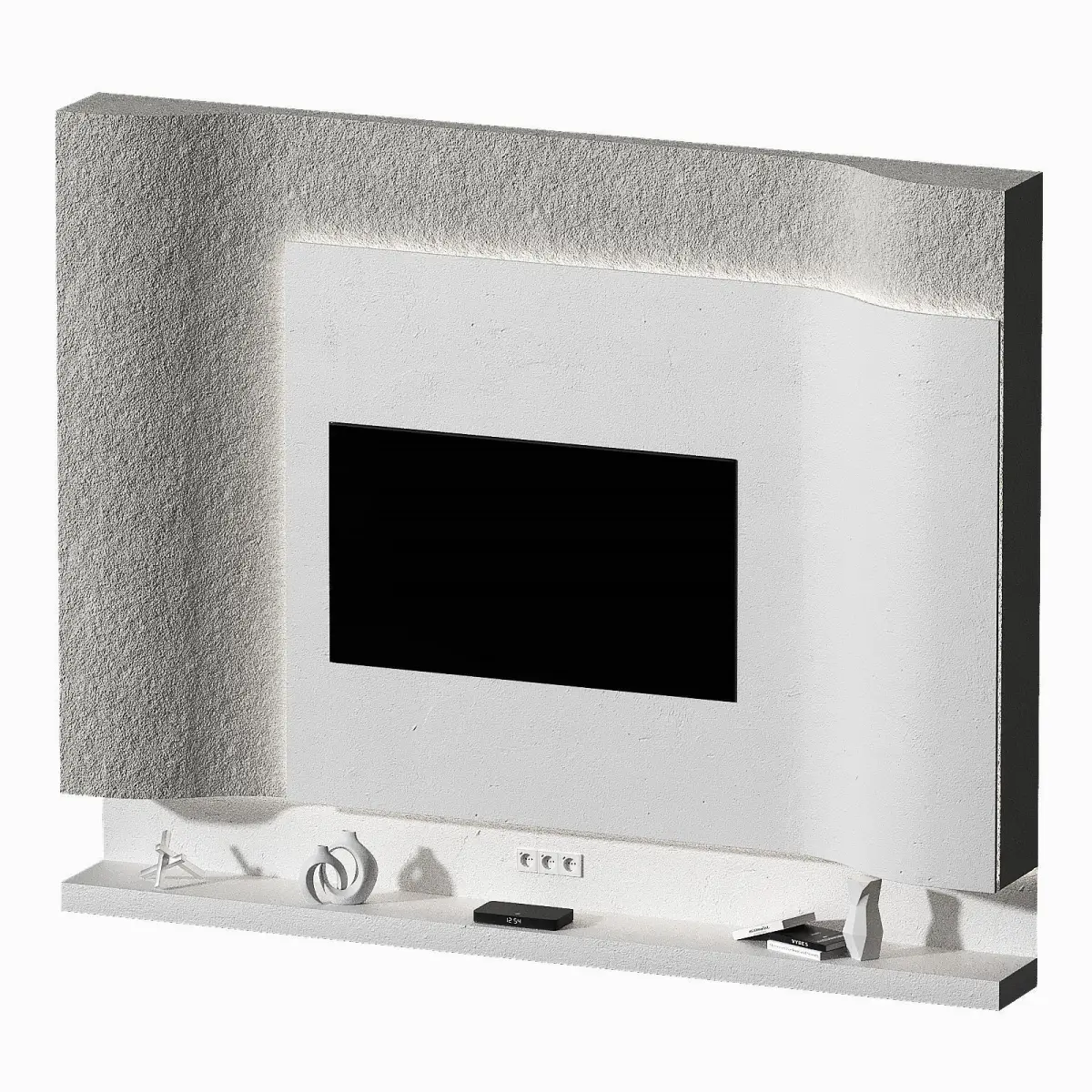 The set includes TV wall panels of a smooth wavy shape with lighting, a niche under the TV with a shelf, a TV set-top box, vases, books, decor, sockets.High-quality seamless high-resolution plaster textures. Suitable for close angles.Suitable for minimalist, modern, scandinavian styles.