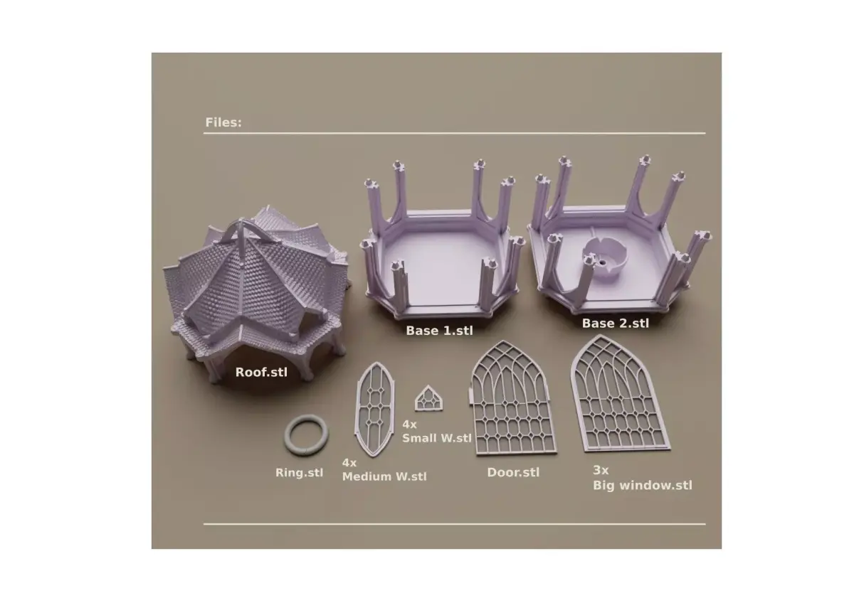 Gothic 3D lantern, perfect for creating special lighting and setting the mood in any corner of your home.The model is designed to be easy to print: most parts don’t require supports; you only need a few under the roof to ensure good adhesion.Approximate height: 28 cm (scalable down to about 60% 16,5 cm).Assembly is very simple: the window panels slide into the slots in the base and the roof. One of them has a hinge; place it on the correct side, aligned with the arches.Finally, glue the base and roof together using cyanoacrylate or contact adhesive.For the windows, it’s recommended to use a filament change to a translucent filament to simulate glass.Two versions of the base are included, one of them prepared to route a cable so you can connect a light to the mains.Print it, assemble it, and enjoy your lantern!VIDEO: https://youtu.be/LGOYGyIOI3A