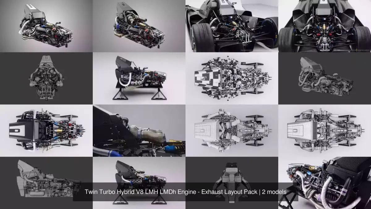 A complete set of two Twin Turbo Hybrid V8 LMH LMDh Engine configurations designed for concept cars, motion graphics, and high-end 3D visualization. This bundle includes both the Center Exit Exhaust Layout and the Over-Engine Exhaust Layout, giving you two distinct design directions while keeping the same core V8 structure.