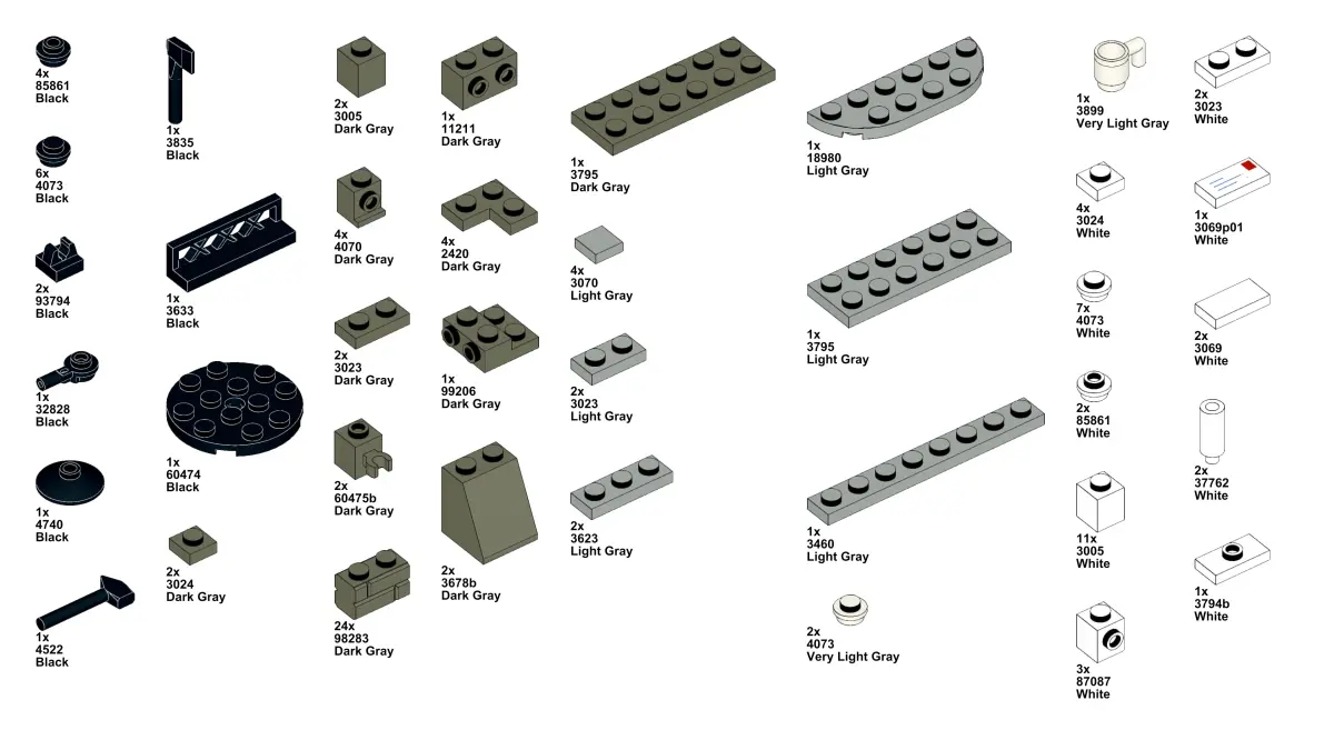 3D LEGO Brick Templates: This file includes templates from the specified LEGO set, with each design provided as a separate object scaled to the exact dimensions of real LEGO bricks. This is crucial for ensuring that the 3D printed parts are fully compatible with actual LEGO pieces.