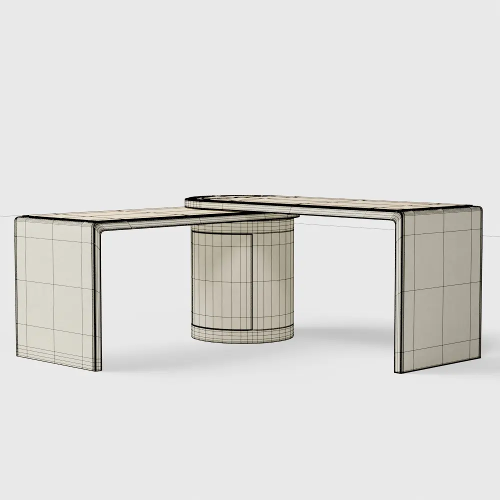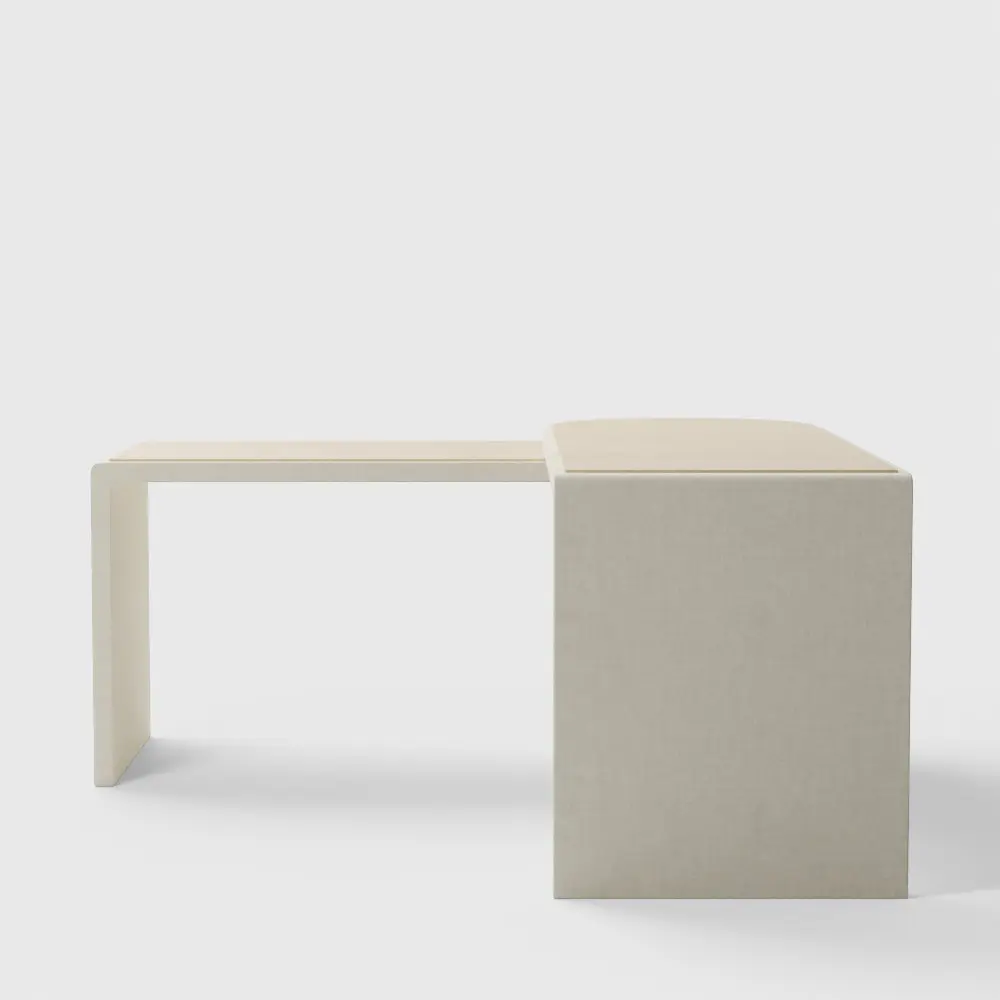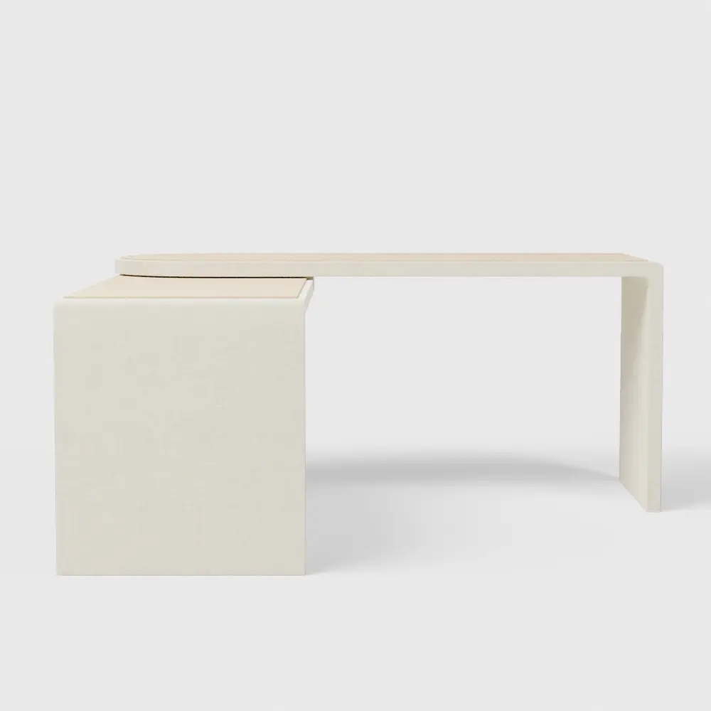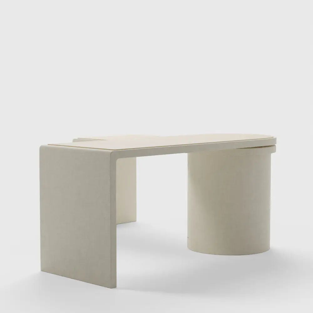 Twist desk pivots on a round hub to serve a variety of functions. In its compact form, the table surfaces nest to create an office desk. Expanded, they part to become an expansive executive desk or angle as a corner desk. In fact, the desk rotates a full 360 degrees, creating any number of configurations to suit your space. The drum-shaped hub has an integrated door that opens to a fixed shelf for storage. To complement its sculptural silhouette, the desk features natural white oak inlay work surfaces with the rest of the frame finished in natural grasscloth. A bold approach to home office decor, the Twist desk is a Crate and Barrel exclusive.