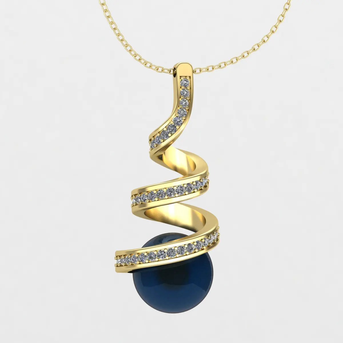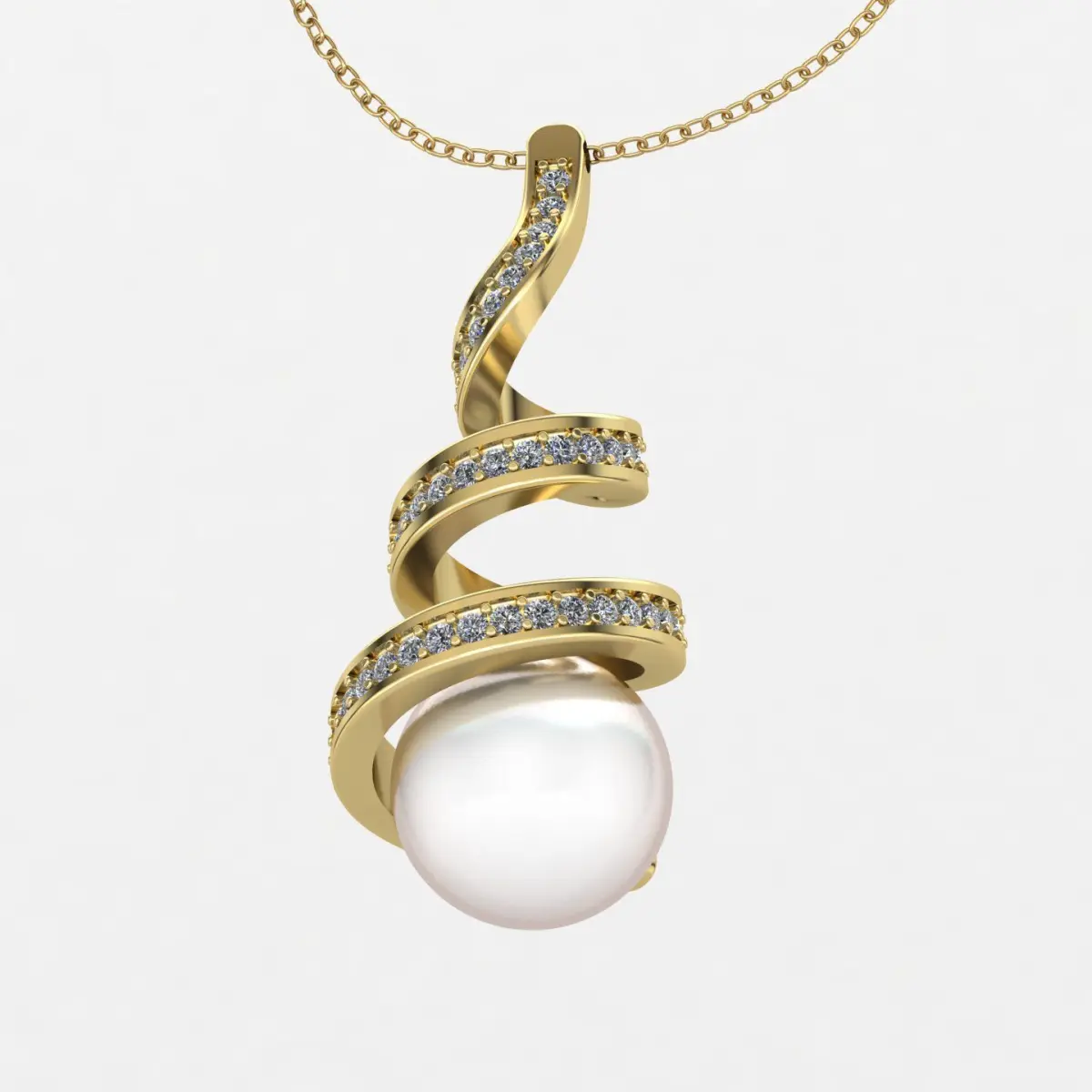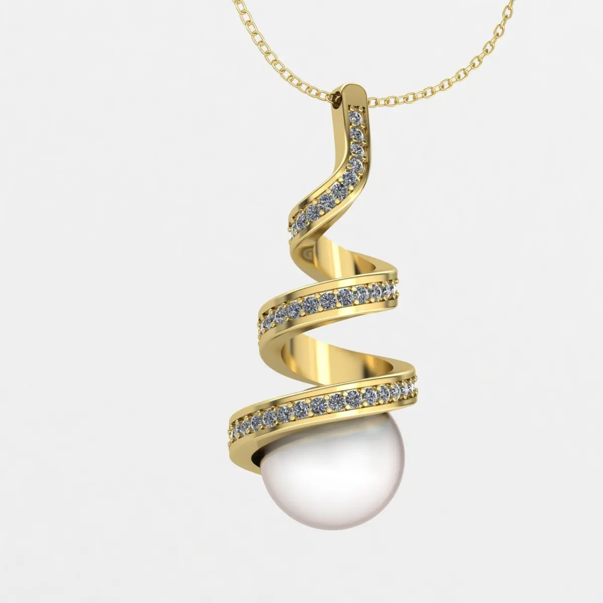 Pendant with spiral design. A 12 mm pearl is placed at the end of the pendant and 69 round gems of 1.4 mm size are on the pendant.The approximate dimensions of the pendant without pearls are 16 x 16 x 34 mm.The thickness of the pendant is 1.8 and the width of the parts on which the stone is dipped is 3 mm. The weight of the 18 carat yellow gold pendant is about 6.9 grams