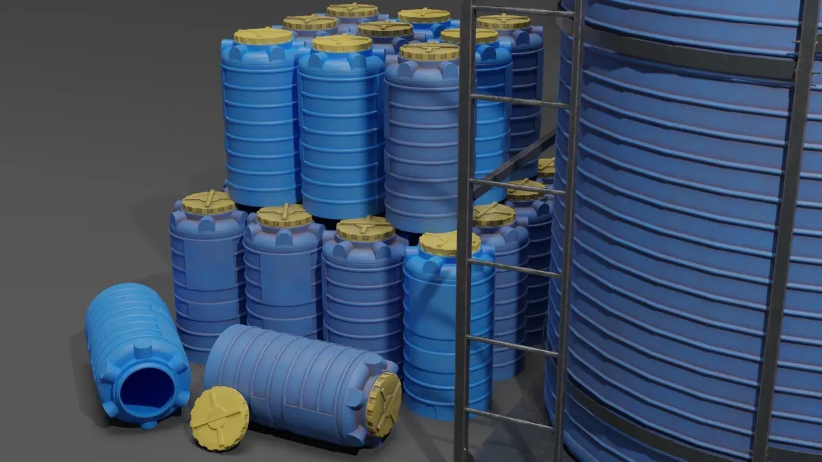 Models for games and synimatics (scenery)Models of two barrels and one metal frame with a ladder for a large barrel.