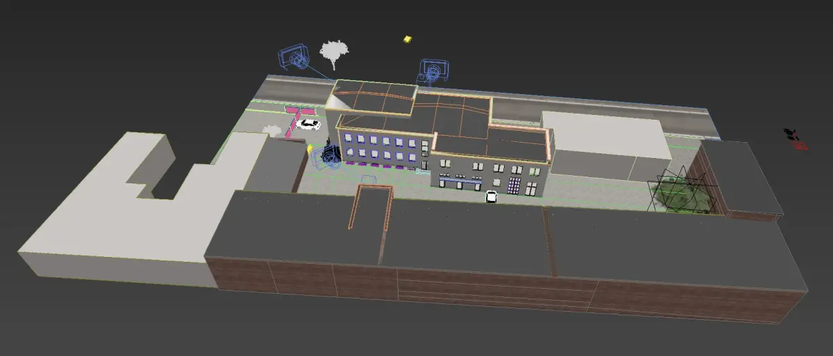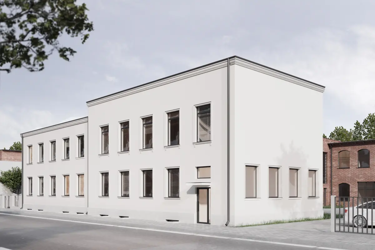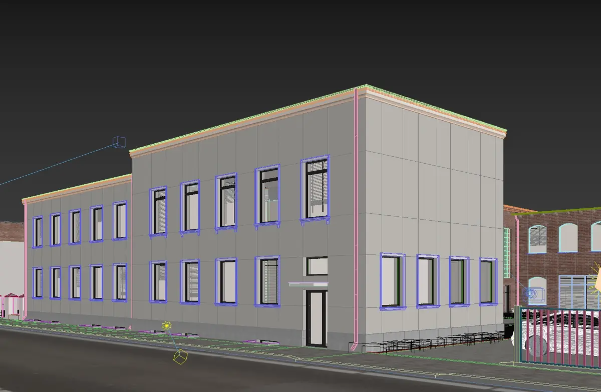 These are two buildings with an industrial function/ They have been modernized and adapted to new functions. One building is made of brick, the other is plastered. The surroundings have been added to the building model. Only the exterior, there is no interior.