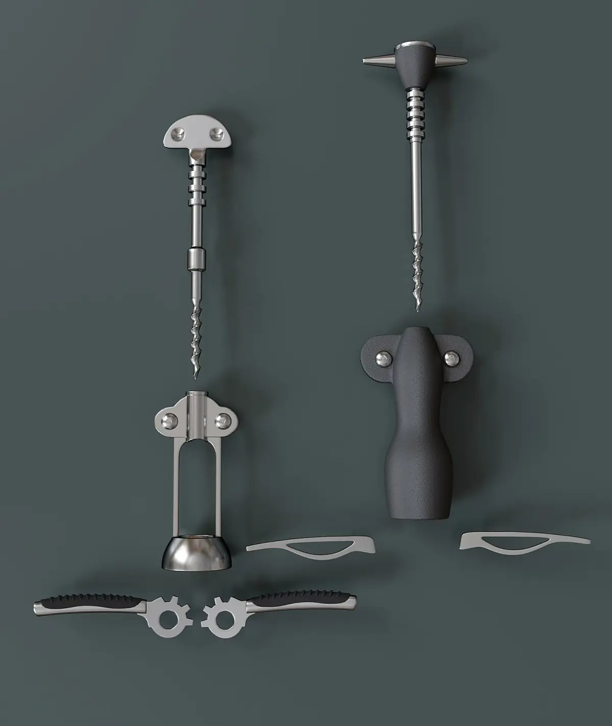 The set includes two different wine corkscrews. Models consist of several moving objects. (shown in the picture) Objects are not linked to each other. Textures were not applied.