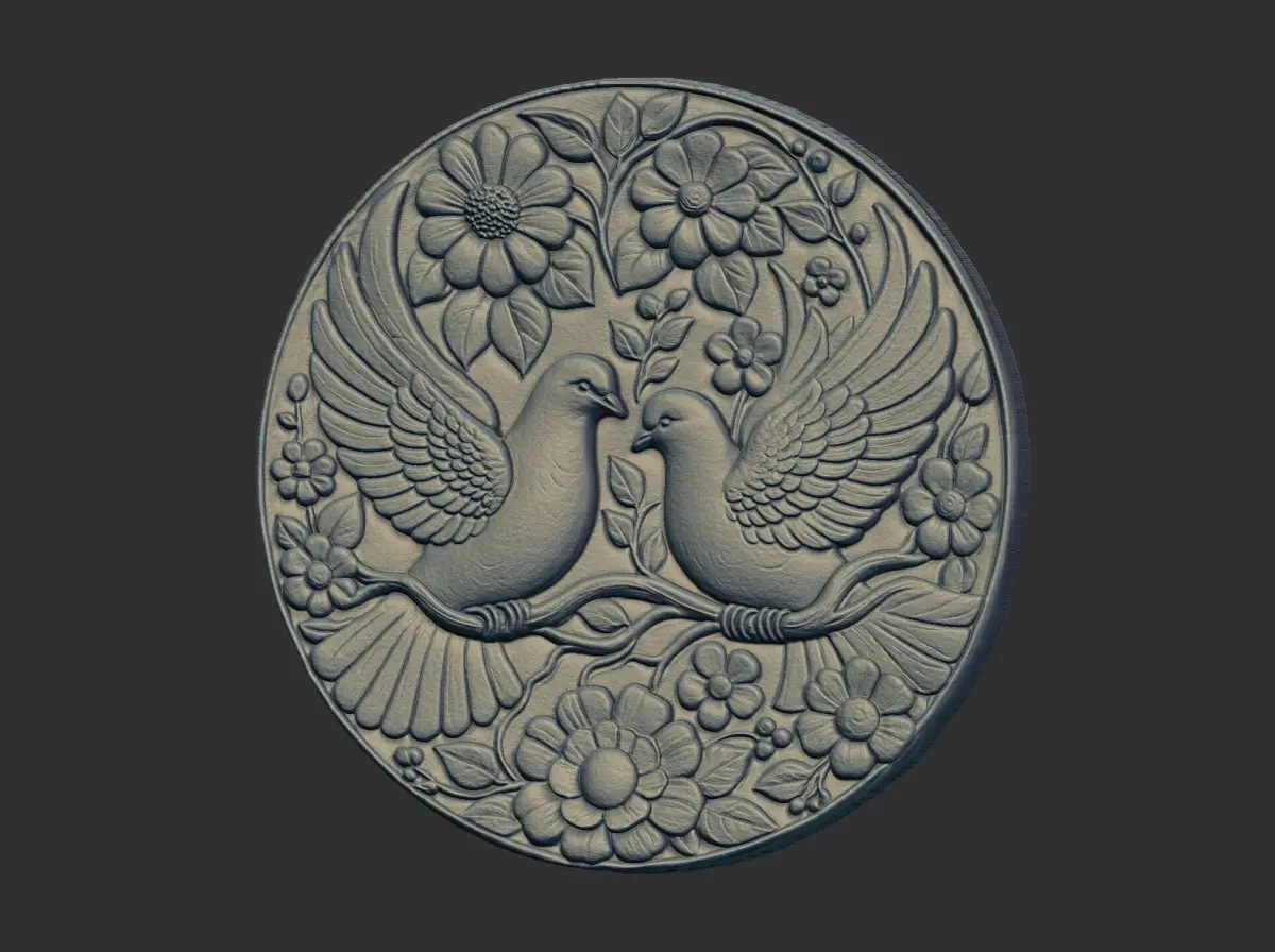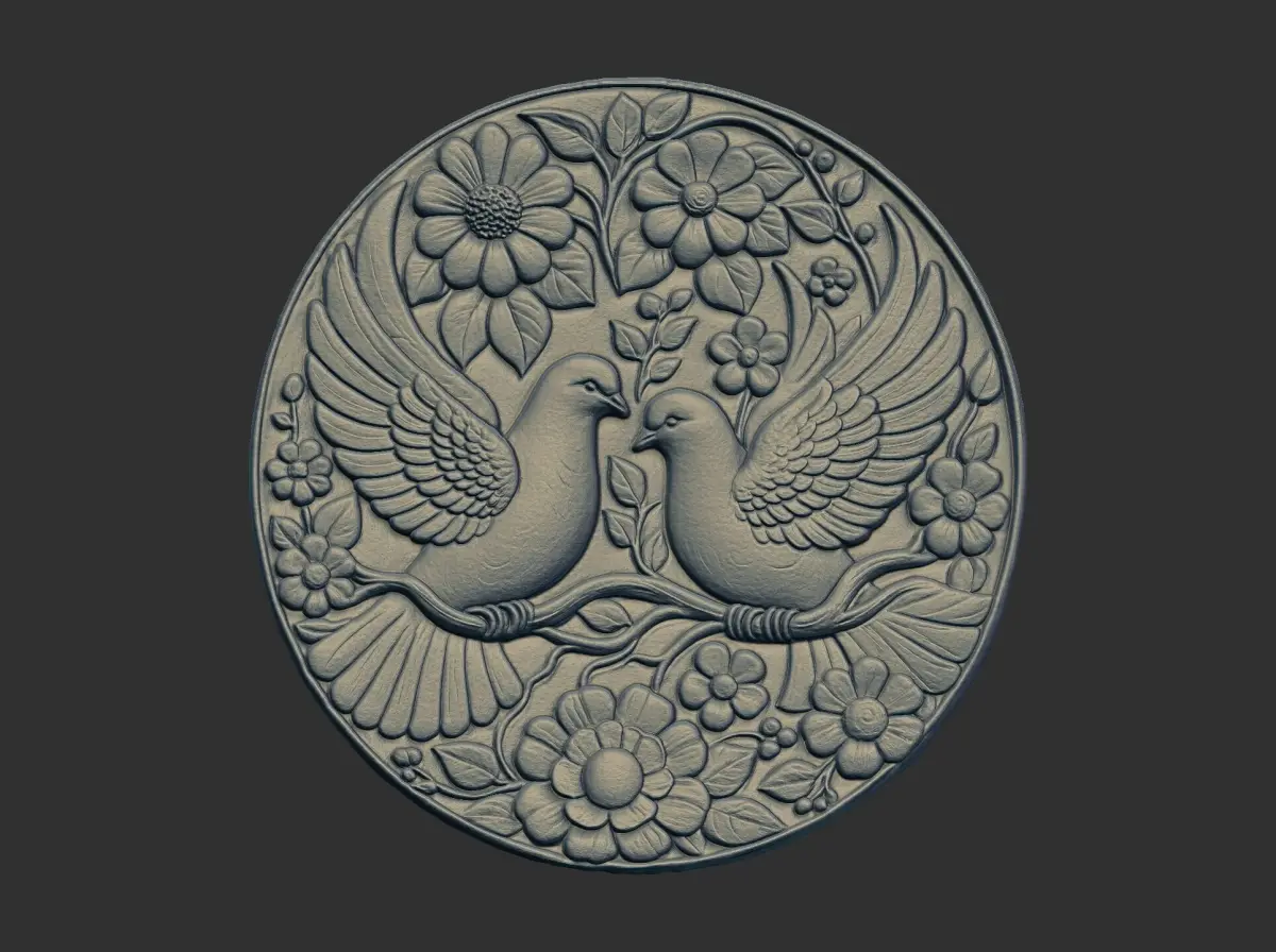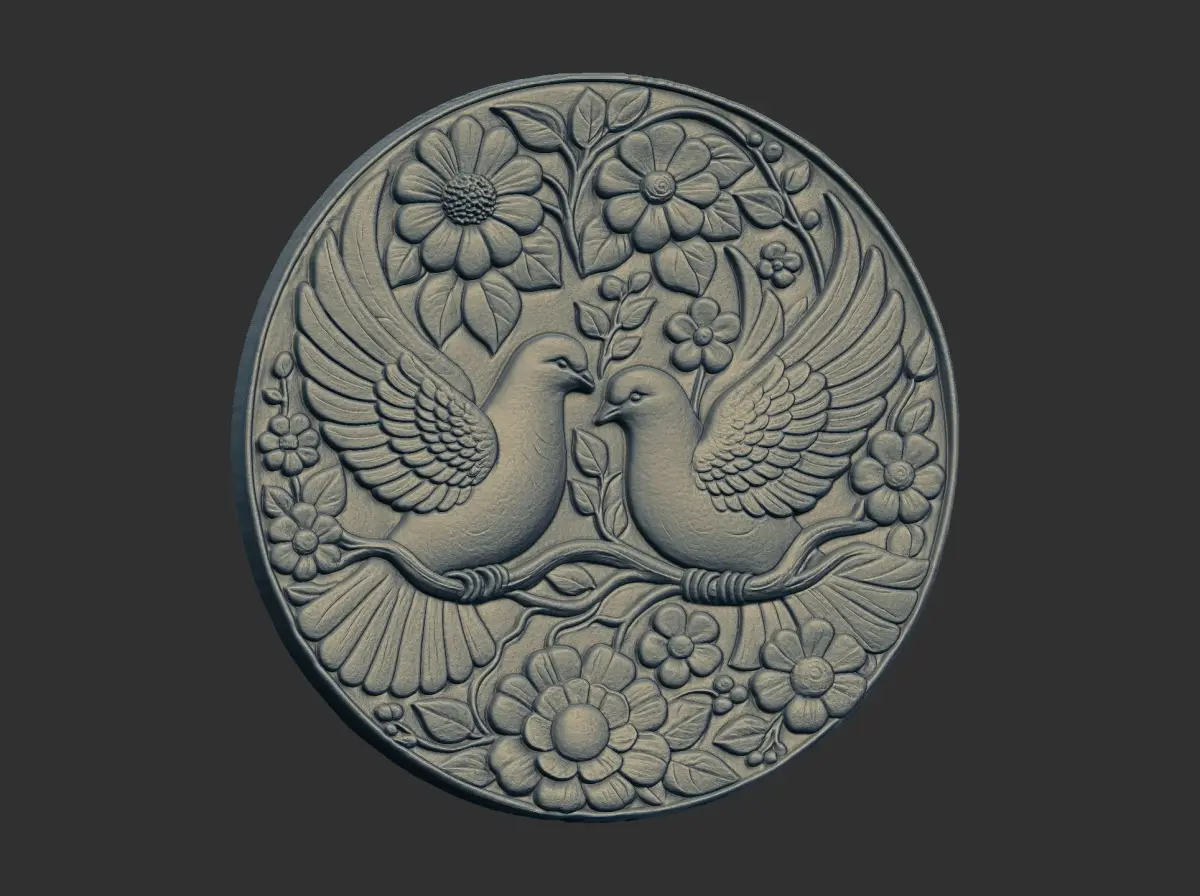 The image shows an embossed plaque featuring two doves on a branch surrounded by flowers. This type of design is often associated with themes of peace, love, and hope. Doves, particularly white doves, are widely recognized symbols of peace, love, and purity across various cultures and religions, including Judaism, Christianity, Islam, and Paganism. They are also commonly associated with concepts of freedom, new beginnings, and spiritual guidance. This specific art piece could be:A wall art or home decor item meant to symbolize peace and love within a space.Part of a larger collection of embossed or sculpted artworks featuring natural themes and symbolic elements.An example of 3D relief carving, where the background is carved away to create a raised image.Potentially, a model for a CNC (Computer Numerical Control) machine or a 3D printer, used to create physical carvings or prints from digital designs. CNC machines are frequently used for creating reliefs from various materials like wood.Reflecting a contemporary trend of using dove symbolism in art to advocate for environmental harmony and peace with nature. The material used in the piece is not specified, but embossed art can be created using materials like paper, leather, fabric, wood, and metal. If it's a wood carving, techniques like relief carving and undercutting would likely be used to achieve the 3D effect.