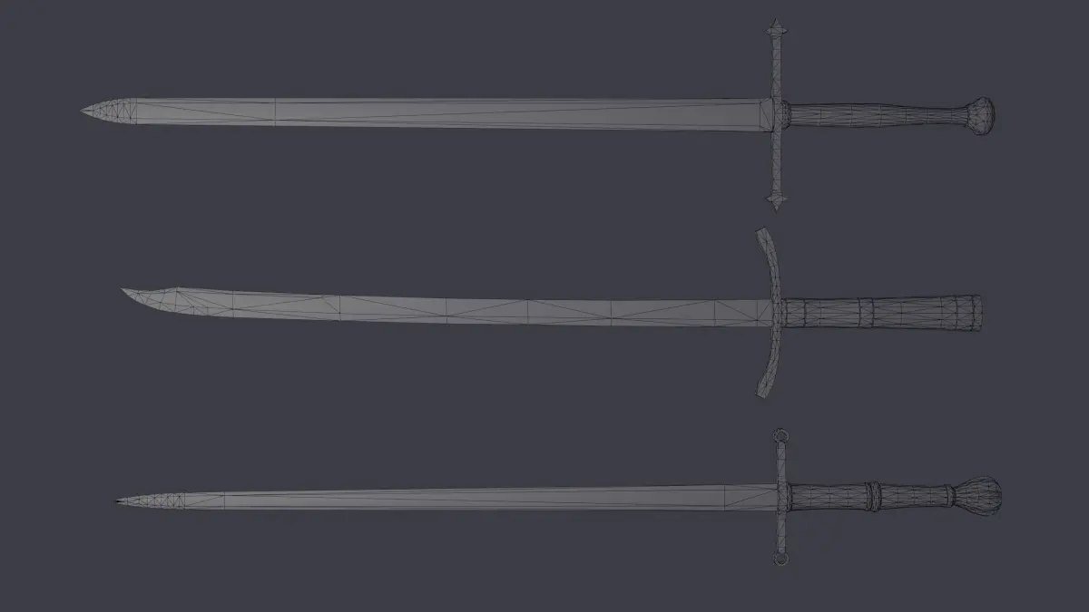 In a set of 3 two-handed swords PBR, the same texture 4096-2048 (albedo, normals dx, normals opengl, roughness, metallic, specular, glossines, orm).