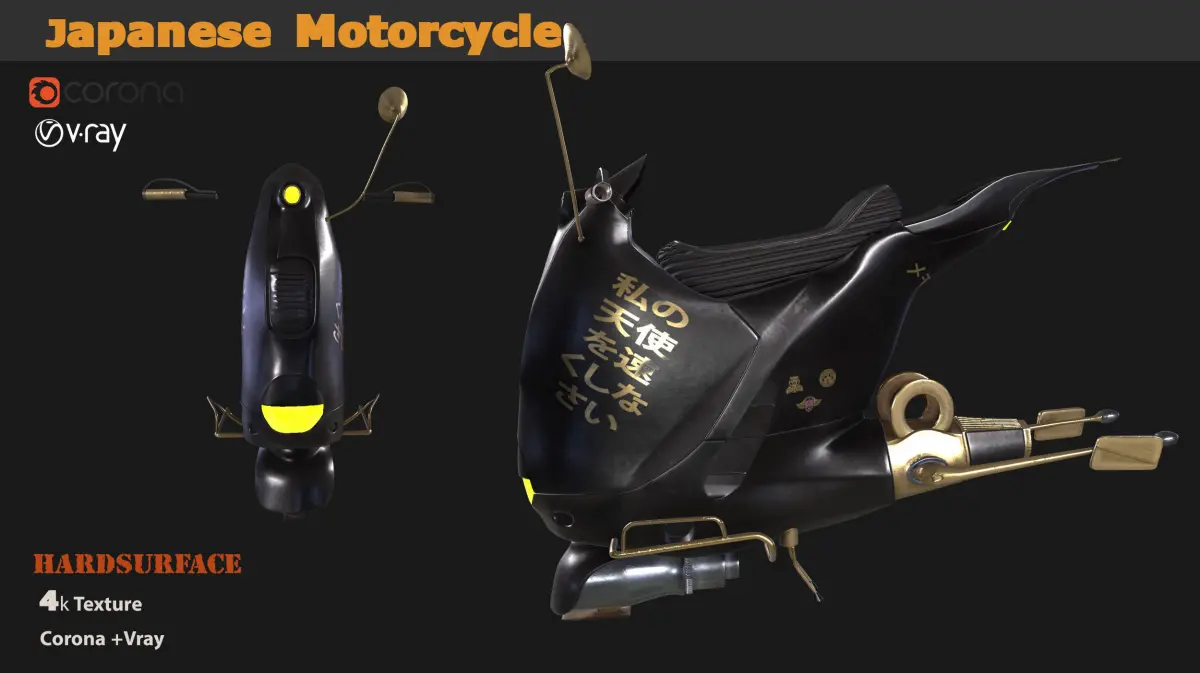 The engine model has a modern and futuristic look and Ciao engine design is used. To make optimal use of this work, in addition to using a fantasy design, a simple black design has also been used in the presentation of the work. All material processing steps are done in substance painter software and the texture resolution is 4k.Name: Japanese motorcycle(One model with two type materials)resolution:4kVersion: 2016Units: CentimetersPolys:480.682Verts:480.768unwrap: YesX Form: YesRender: Corona6+Vray5Formats:3Ds Max2016+Obj