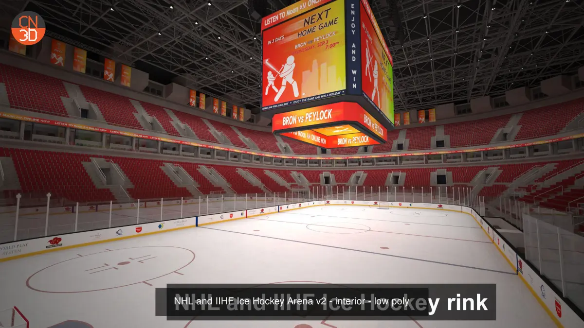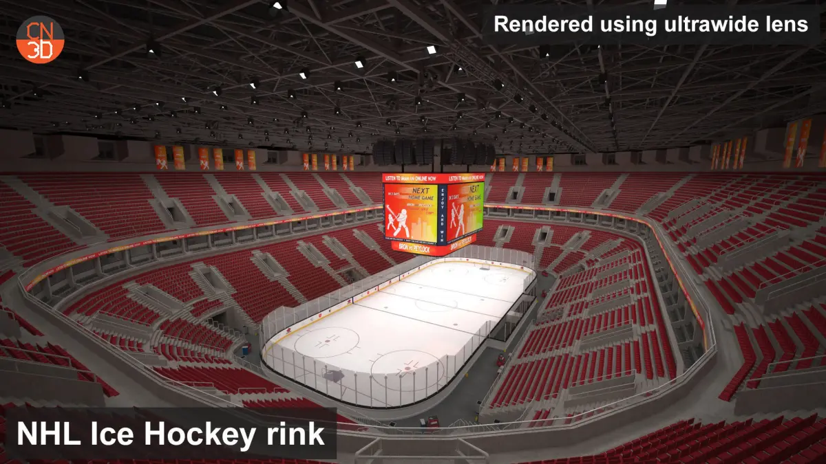 NHL and IIHF ice hockey arenas in real-world size with 18,628 seats, oval ads, a large scoreboard, VIP rooms and seats, tables, detailed roof construction, and many more... NHL rink and IIHF rink are created in real units of measurement modeled on real ice rinks for NHL and IIHF.