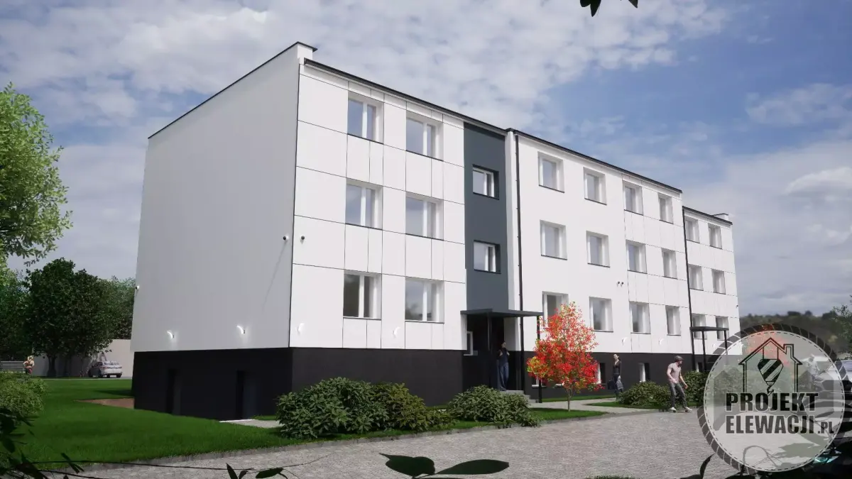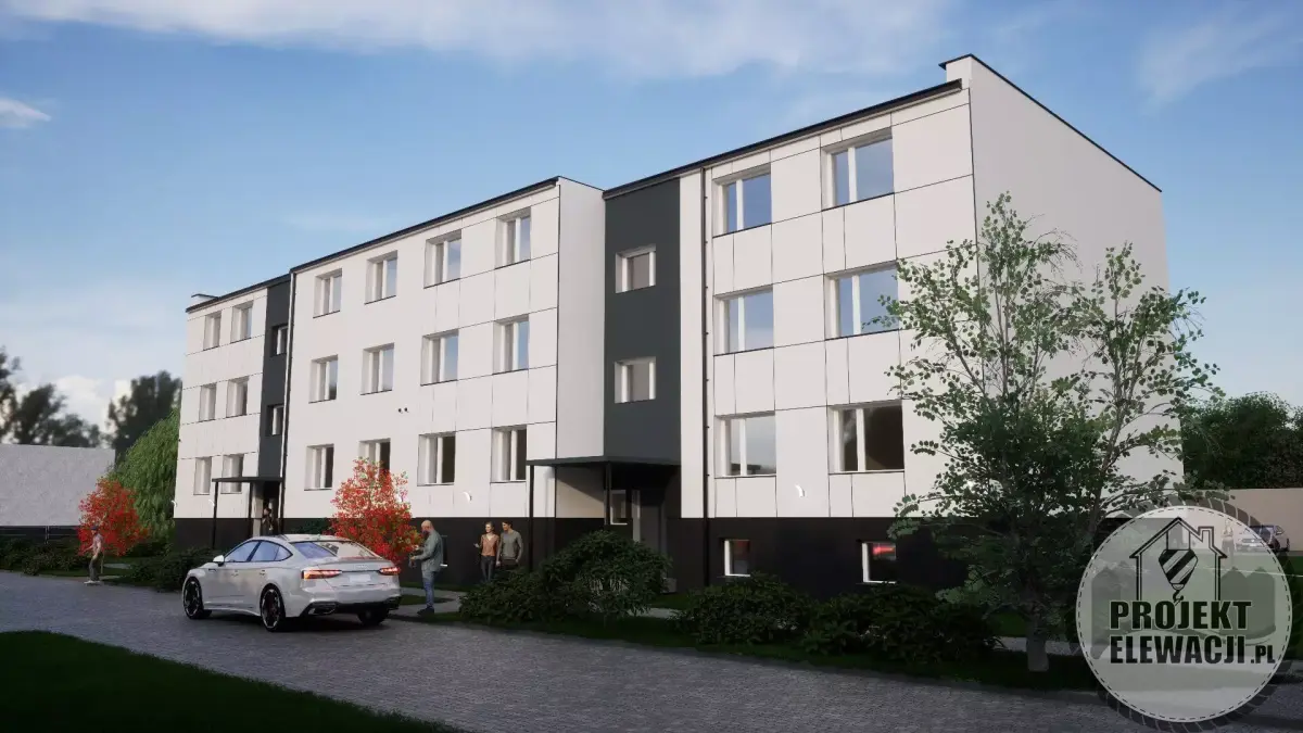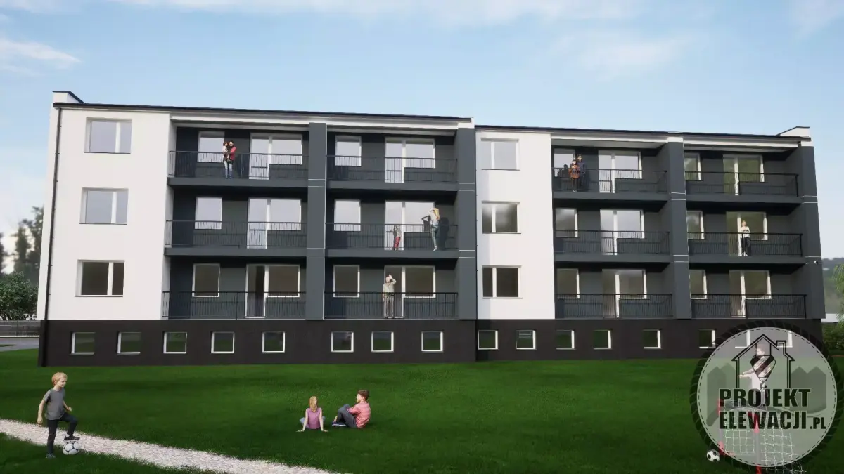 A realistic 3D model of a modern two-segment apartment building featuring elegant architectural detailing and façade articulation.The design includes decorative pseudo-boni (imitation joints) and anthracite façade inserts, creating a refined contrast between light and dark surfaces.This model reflects real construction logic and proportions, making it ideal for architectural visualization, real estate presentations, or urban simulations.