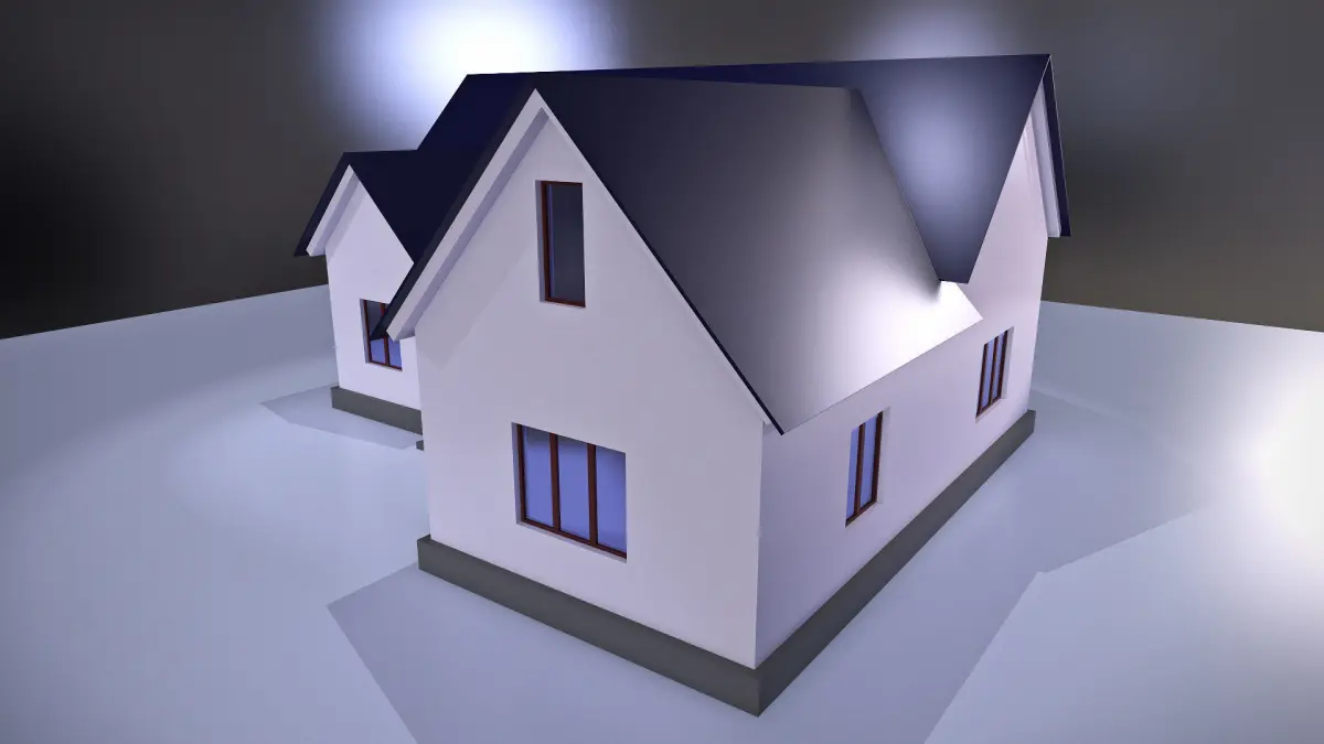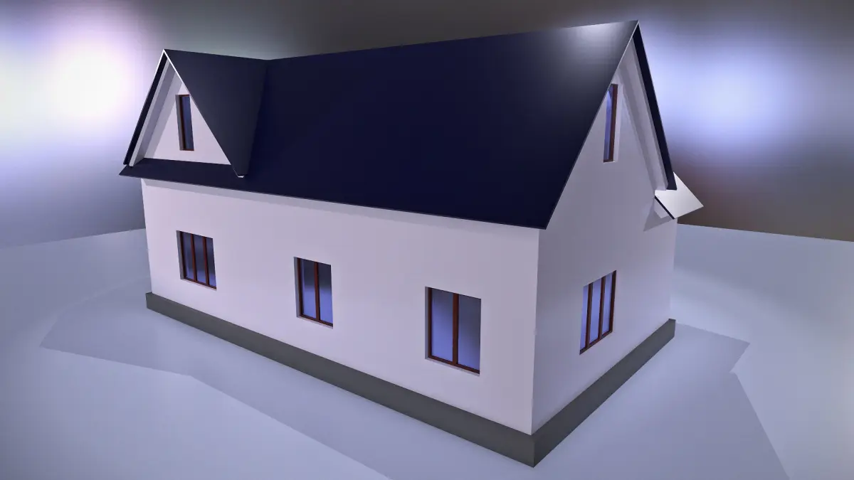 The model of a classic American country cottage with white facade and the dark grey roof. The second floor of the house is mansard. Two grey steps lead to a small porch and the entrance door. Window frames are dark brown. Ready for game-development, render and animation.