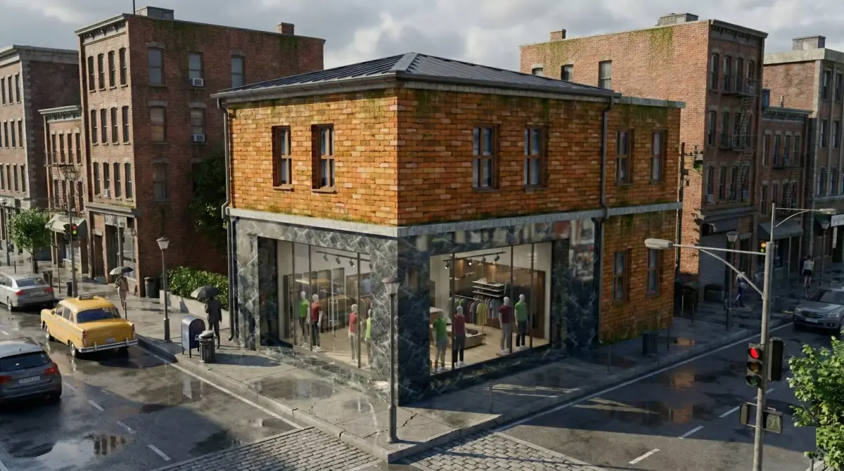 This realistic two-story corner building 3D model is ideal for modern city scenes, urban environments, and street-level game or visualization projects. The structure features a brick upper floor with detailed windows and a ground floor glass shopfront, making it perfect for shops, showrooms, cafes, or commercial spaces.