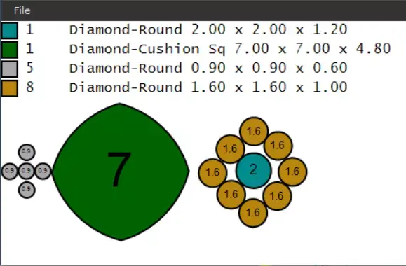 Diamond Size and Carat Weight: 14 brilliant cut diamonds and 1 cushion cut diamond. Total diamond weight 1.94 carats. Check the diamond chart attached in the image.