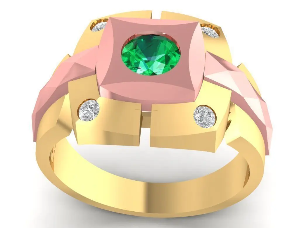 This 3D model presents a bold geometric men’s ring designed in a two-tone combination of yellow and rose gold. The centerpiece features a round-cut gemstone—available in emerald green or diamond white—framed by strong angular lines that enhance its masculine appeal.