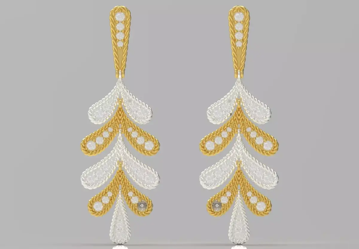 The JE0119 earrings are a stunning piece of jewelry that is inspired by nature, showcasing elegance and brilliance. These drop earrings are made with an artistic combination of shiny yellow gold and sparkling white gold, which gives them a special and distinctive look.