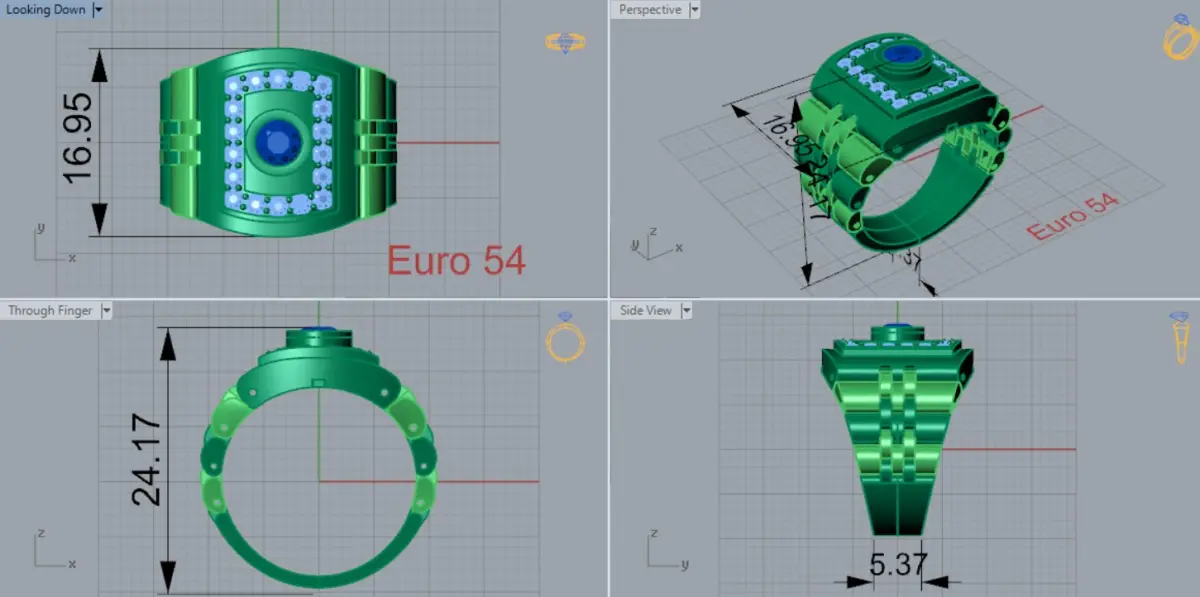 At the top of the ring, there is a square bezel that houses the distinctive center stone, the diamond, surrounded by smaller diamond stones that create a brilliant border around it. The arrangement of these stones gives a special beauty and elegance to the overall design of the ring.