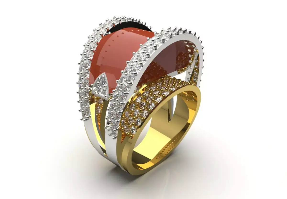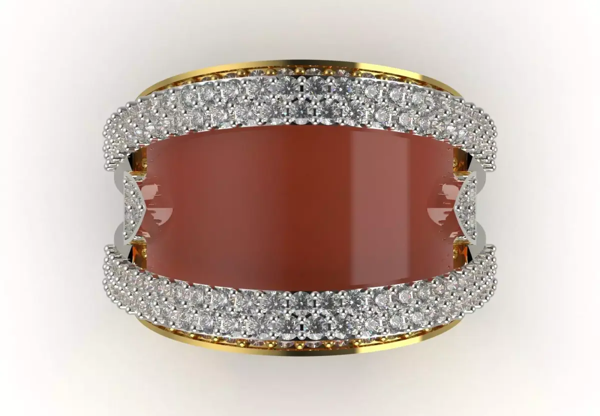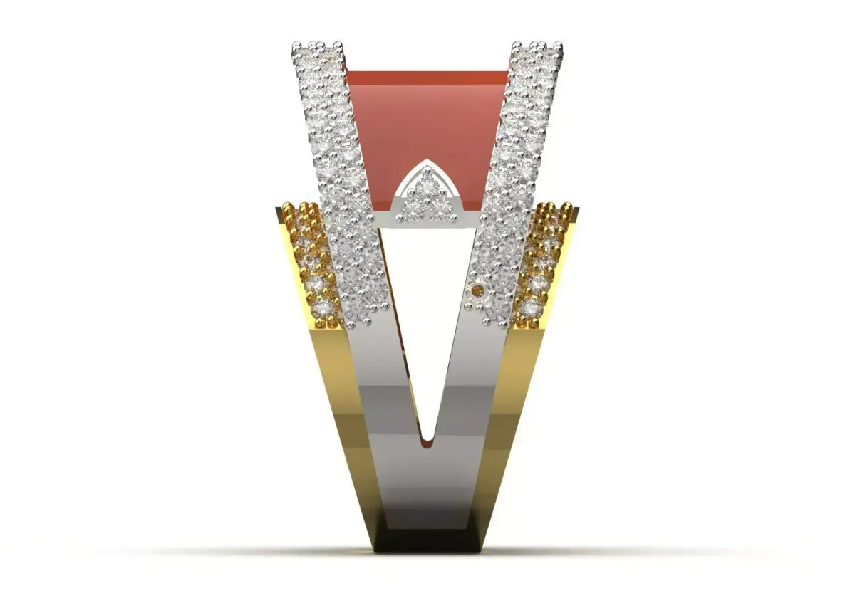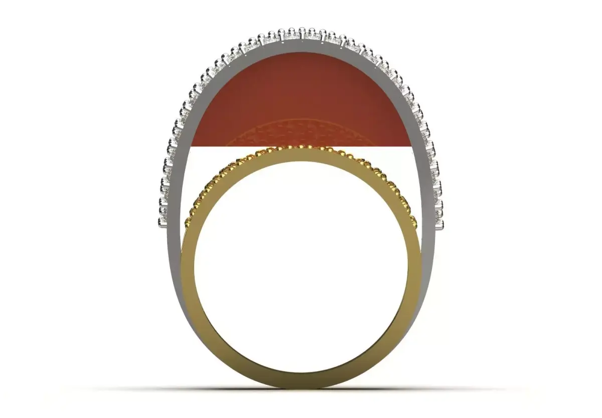 Technically, this ring is made of two intertwined rings made of shiny yellow gold and shining white metal (such as white gold or platinum). On the edges of both rings, rows of small diamonds are pavé, creating a unique shine. At the center of the design is a large cabochon stone in brown-red color, which has a polished and shiny surface and creates a wonderful contrast with the diamonds and metals. Also, a unique triangular cut diamond is added to this design to double its complexity and beauty.