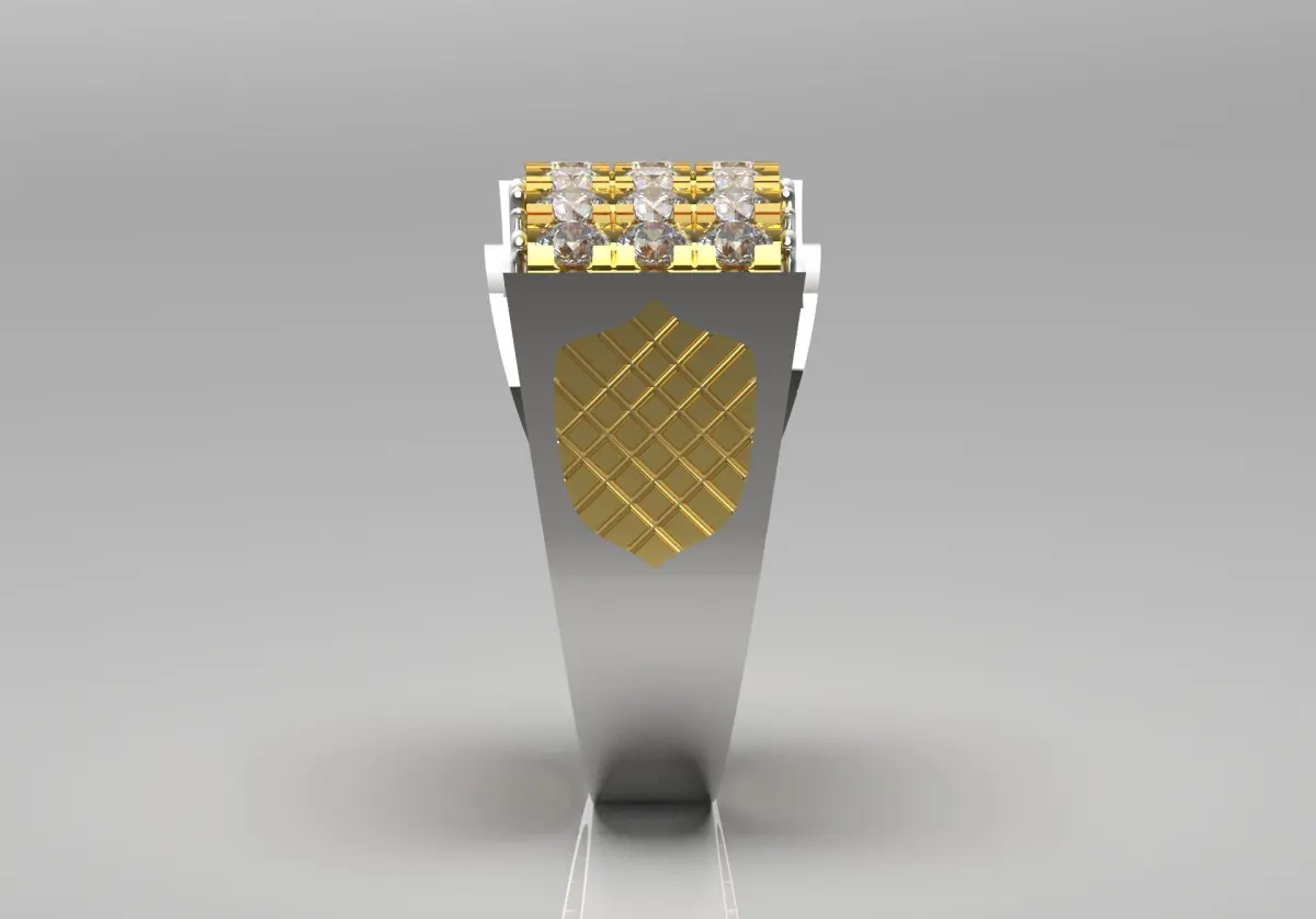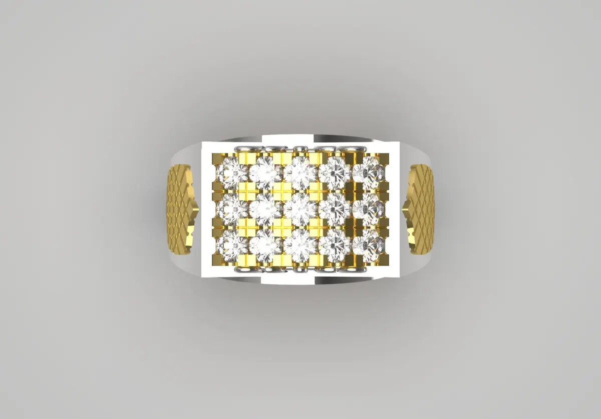 This ring features a unique and contemporary design with a rectangular top adorned with a grid of sparkling diamond stones set in yellow gold prongs that add a touch of luxury. The center is raised and creates an eye-catching focal point. The band itself is crafted from polished white gold, creating a subtle contrast. On one side of the arm, a woven yellow gold design is seen that resembles a woven pattern, adding depth and charm to the overall aesthetic. This ring combines boldness with elegance, making it suitable for casual wear.