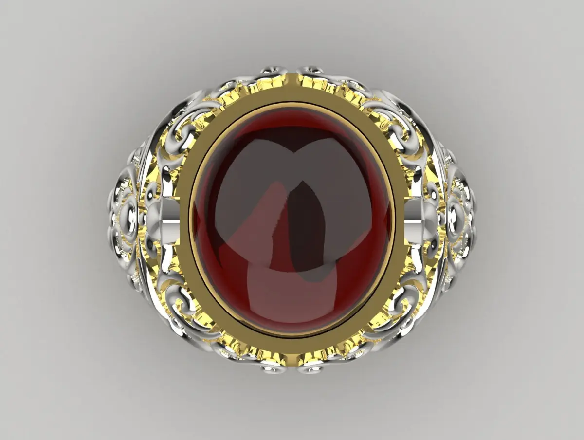 This ring has a sophisticated and luxurious design, with a shiny gold metal band forming the inner part. The outer part of the ring consists of silver metal with artistic and stylish details, full of unique and fancy designs that have wavy shapes and delicate curves. On the top, a large and beautiful gem in the form of a vertical brown stone is placed, the upper part of which is in the form of a shiny bubble, and has a sparkling and attractive appearance. This design contributes to a royal and luxurious look, suitable for those who are interested in jewelry with classic yet artistic designs.