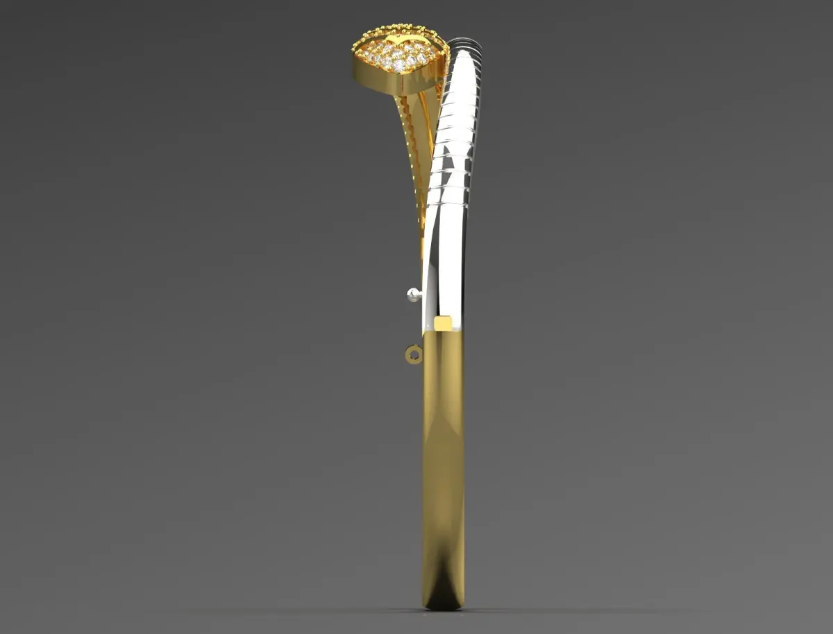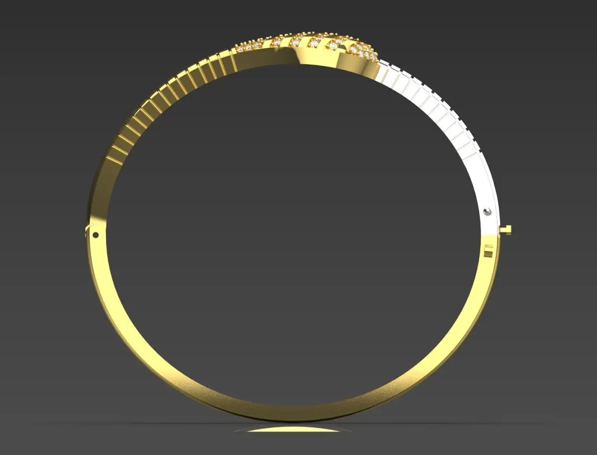 This image shows a stunning bracelet with a unique design that combines yellow and white gold elements, creating a striking contrast. It has a curved structure that is reminiscent of a delicate leaf or feather. The gold section has intricate detailing, with small sparkling diamond stones adding to its elegance. The white gold section has a smooth, shiny finish that complements the textured gold and adds depth to the overall look. This piece has a contemporary and stylish vibe, making it suitable for both formal and informal occasions. Overall, this bracelet seamlessly combines luxurious materials with artistic design, making it a standout accessory.