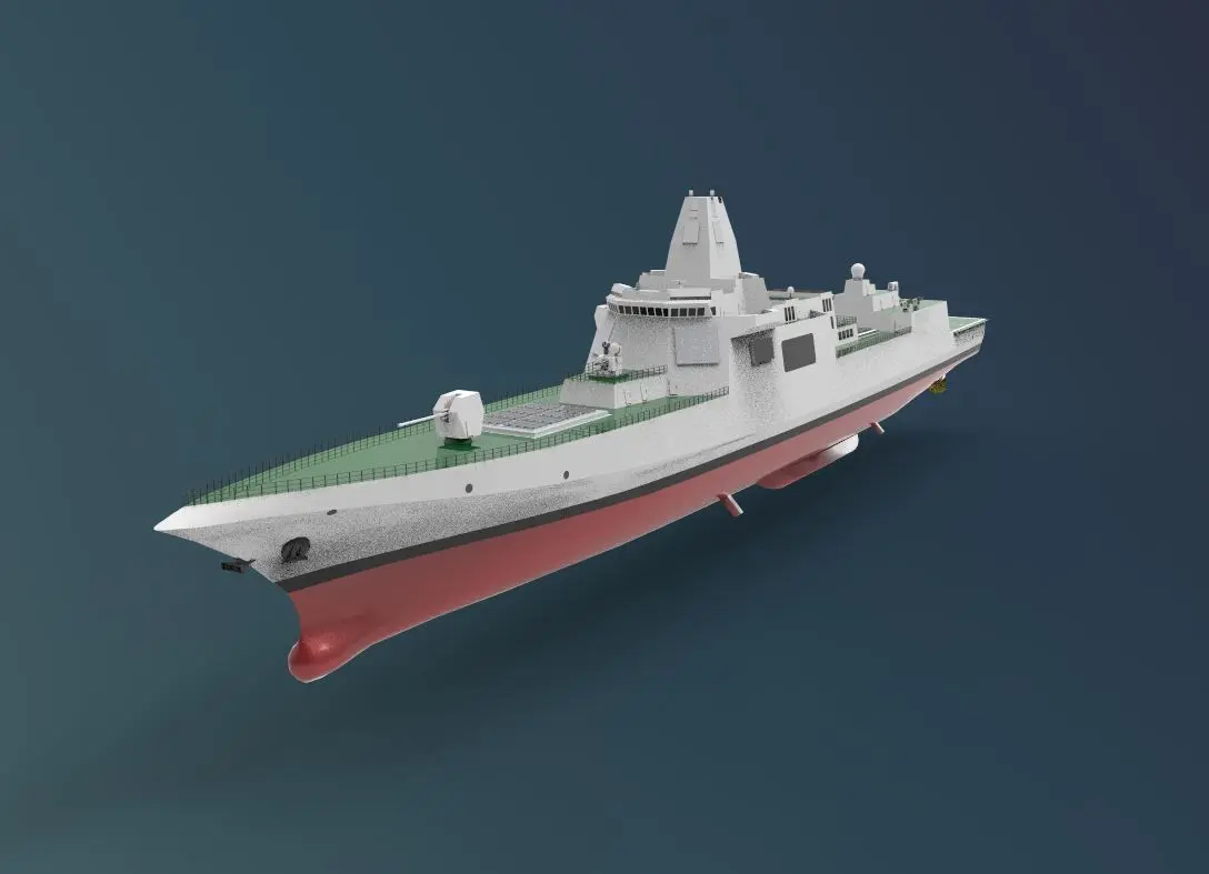The 3D model design of the Type 055 destroyers, also known as the Renhai class, showcases the advanced technological and architectural prowess of China's naval engineering. These models accurately represent the ship's sleek and modern hull design, which enhances stealth capabilities by reducing radar cross-section. Detailed elements include the integrated mast housing sophisticated sensors and radars, the extensive vertical launch system (VLS) capable of deploying a diverse array of missiles, and the advanced deck layout that supports helicopter operations. The 3D models also feature intricate details of the ship's weaponry, including the naval gun at the bow and the close-in weapon systems (CIWS) for missile defense. These digital recreations serve not only as educational tools for naval enthusiasts and defense analysts but also as vital assets for strategic planning and virtual simulations within naval training programs. By providing a comprehensive view of the Type 055's capabilities and design, these models underscore the ship's role as a formidable component of modern naval warfare​