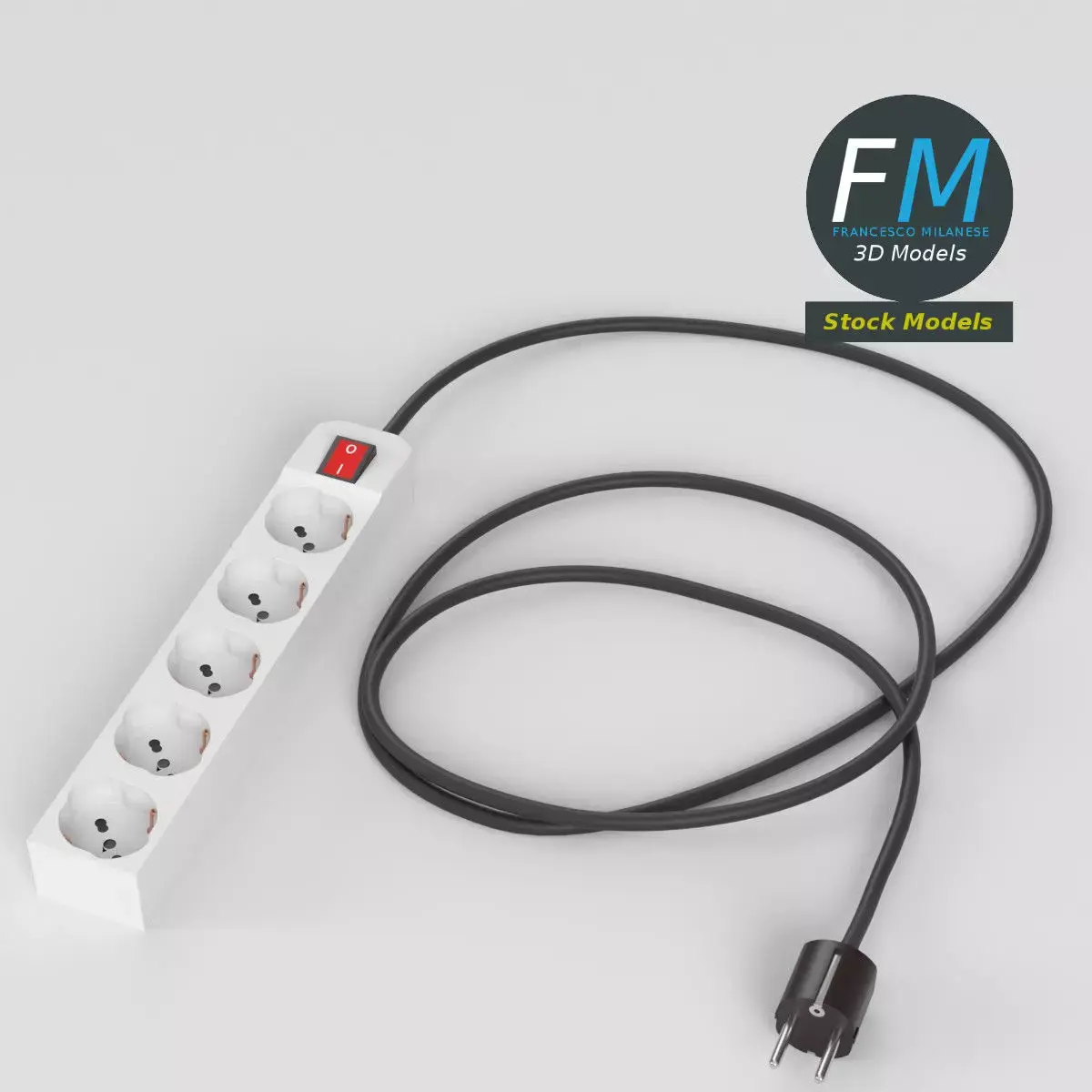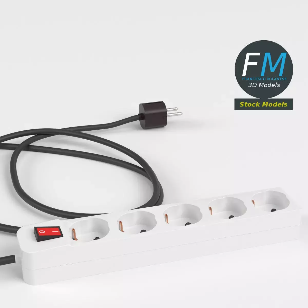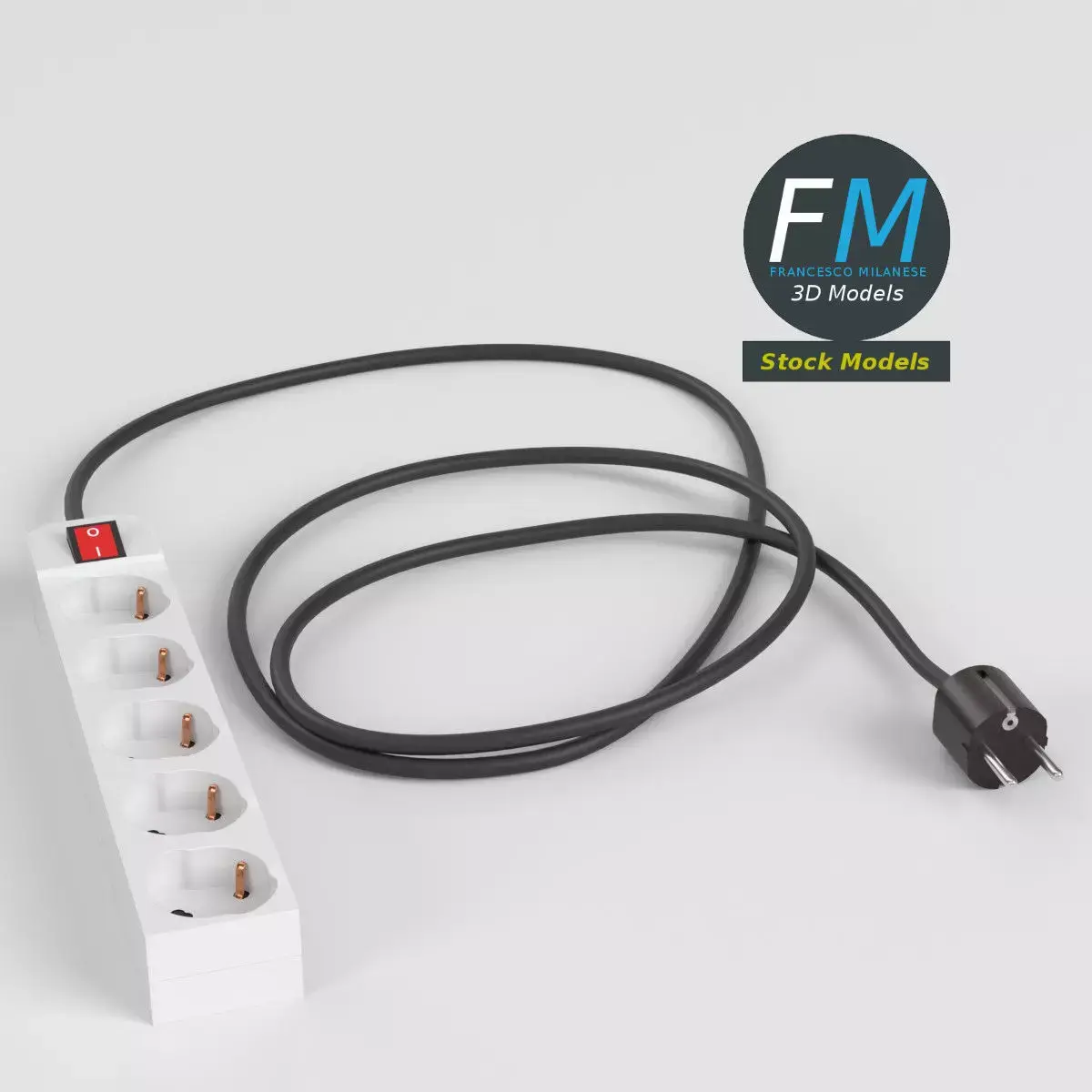 Realistic Type F power strip with cable and plug 3D Model featuring multiple European sockets and integrated on off switch, suitable for household electronics, office equipment, and technical visualization scenes. 1 Object, 1 Material with non overlapping UV Layout Map and PBR Textures set. Production-ready 3D Model with non overlapping UV Layout map provided in the package. PBR Materials and Textures (Metallic Workflow: Base Color, Metallic, Roughness, Normal) embedded in the Blend, FBX, and GLB files.Easily customizable: UV unwrapped geometries; UV Layout maps provided in the package as png with alpha images.Quads-only geometry.Made with Blender 5 with Cycles Principled BSDF (PBR, Metallic Workflow) Material, then exported to other formats (OBJ, FBX, GLB; FBX and GLB have embedded textures).Promo images: some renderings made with Cycles for Blender, plus Wireframes and Blender screenshots (Object Mode, Edit Mode with UVs).Formats included: FBX with embedded PBR Textures (Metallic Workflow: Base Color, Metallic, Roughness, Normal), GLB with embedded PBR Textures (Metallic Workflow: Base Color, Metallic, Roughness, Normal), OBJ; scenes: BLEND (with Cycles Principled (PBR) Materials); other: 16-bit PNGs with Alpha.1 Object (mesh), 1 PBR Material, UV unwrapped (non overlapping UV Layout map provided in the package).UV Layout maps and Image Textures resolutions: 2048x2048.Polygonal, QUADS-ONLY, 25330 vertices, 24631 quad faces (49262 tris).Real world dimensions; scene scale units: METERS in Blender 5 (that is: Metric with 1.00 scale).Uniform scale object (scale applied in Blender 5).PBR Textues included: in a zipped folder, you'll find the PBR Textures set (as 16-bit PNGs with Alpha).IMPORTANT --- Main renderings made with Blender 5 + Cycles using an HDR Environment Texture Image which is NOT provided in the package!