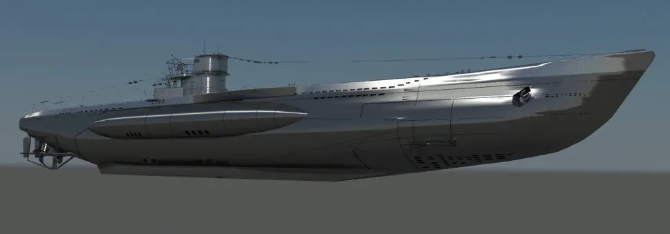 The type VII_C was a bit larger than the type VII and was also more sea worthy, it became the model for large oceanic submarines. Despite it, the discovery of radar and sonar, soon overcome the visual detection means the subs had, and this lead to their defeat. The model shows the main new features like the snorkel, the larger sail and heavy guns mounted on it, or the internal aft torpedo tube.