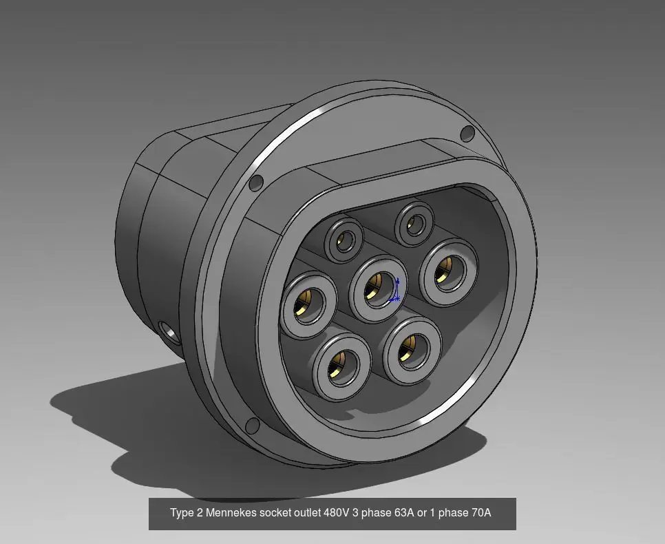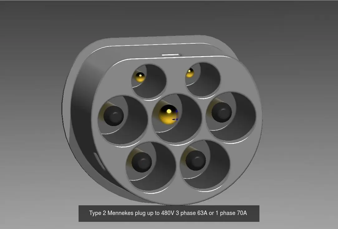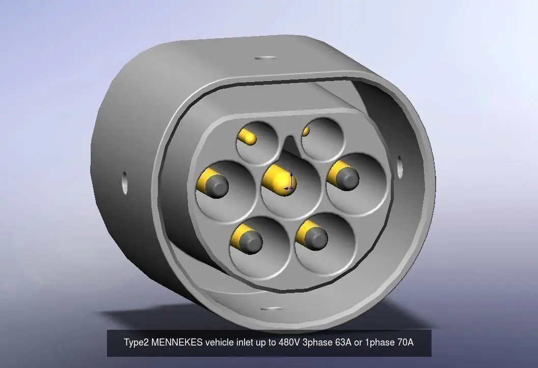 Collection of all Type2 MENNEKES configurations that are induced in IEC 62196-2-2011 . Each metal contacts of this models is designed as a separate solid body that you can conveniently and easily cancel in your software if you do not need them. You can use it for manufacturing, projecting your custom thigs or just render. Project contains files PDF 3d\IGES(igs)\STEP(stp)\STL\3MF\AMF. Check my other EV connectors 3d models. Any questions. Open for work.