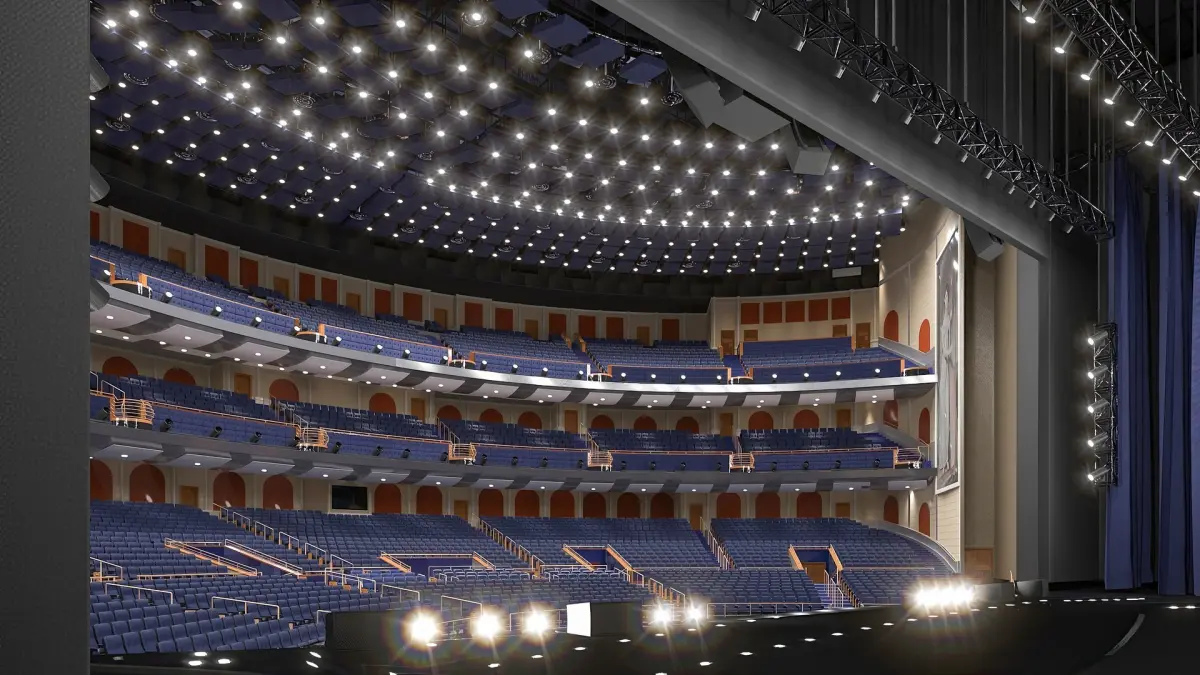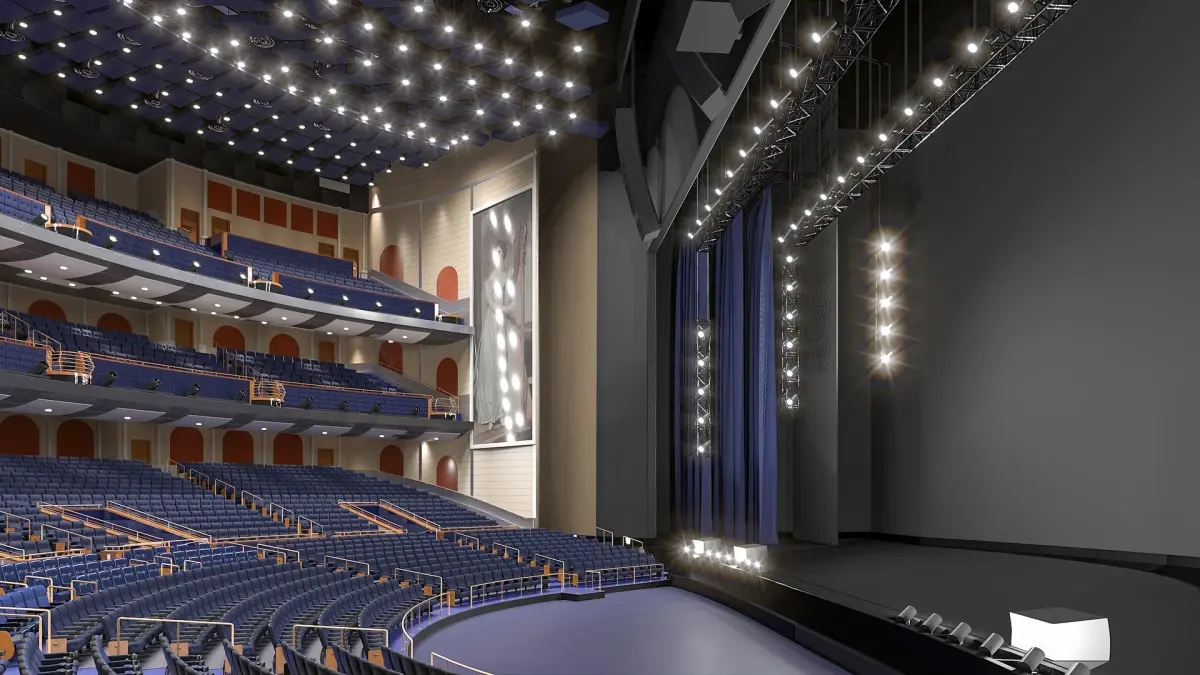 Interior of theater, that is a large auditorium designed for high-profile shows. Its layout includes tiered seating, refined lighting, and a deep stage area. The venue can be used for major concerts and resident performers.