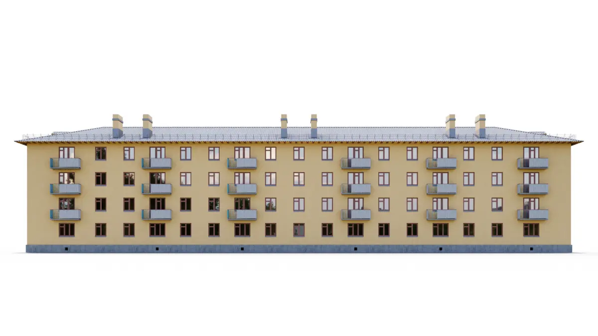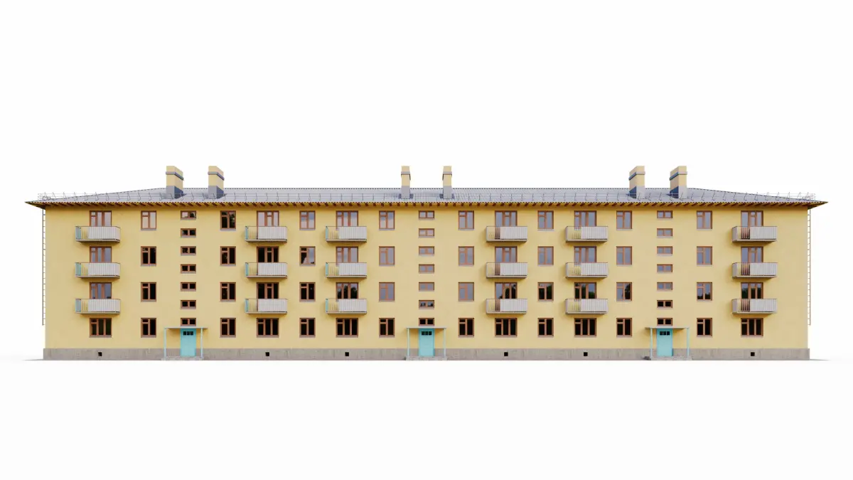 Highly detailed model of a brick Khrushchev building of the 1-443 series.Four floors, three entrances, 48 apartments.The model includes internal staircases of the entrances, layouts of all apartments with interior partitions and doorways