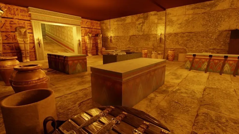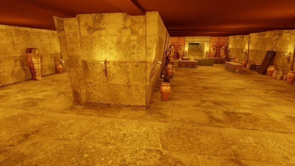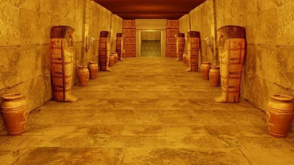 A dual-purpose corridor in a dramatic U-shape: one side for sacred procession, the other for dark punishments and mummification rituals