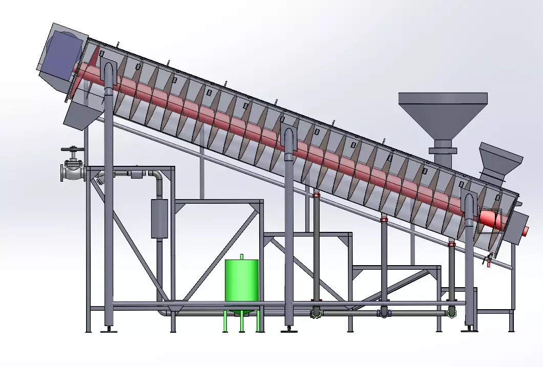 - Core Structure and Functional Breakdown2.1 Main Conveying MechanismU-Type Trough Body: The U-shaped cross-section closed trough is used as the material conveying channel, with high structural strength and excellent sealing performance. It can completely prevent material leakage and dust emission, while providing a stable installation reference for the screw assembly, perfectly adapting to the working conditions of inclined conveying.Screw Conveying Assembly: The core working component is a continuous screw blade welded to the central transmission shaft. Driven by the motor to rotate, it pushes the material upward along the U-shaped trough through spiral thrust. The blade is made of wear-resistant material, which can adapt to materials with different characteristics and ensure conveying stability and equipment service life.Drive Unit: The top of the equipment integrates a motor and reduction mechanism, providing stable and adjustable power output for the screw shaft. The material conveying capacity can be adjusted by controlling the rotating speed to meet different production capacity requirements.2.2 Feeding and Discharging SystemFeeding Mechanism: The lower end of the equipment is equipped with dual feeding ports, including a large-diameter conical hopper and a side square feeding port, which can adapt to different feeding methods (such as manual feeding, equipment docking feeding) to meet diversified feeding needs.Discharging and Pipeline System: The equipment is equipped with a complete set of discharging pipelines, valves and collection structures, which can accurately control the discharge and shunting of materials. At the same time, it integrates auxiliary pipelines, which can adapt to process requirements such as cleaning and ventilation, expanding the equipment's application scenarios.2.3 Support and Auxiliary StructureSteel Structure Support Platform: An integrated steel structure frame is adopted to provide stable support for the inclined trough. It also integrates an operation platform, protective railings and stairs to ensure the safety and convenience of equipment installation, operation and maintenance.Auxiliary Supporting Components: Auxiliary components such as storage barrels and pipeline valve groups are integrated under the platform, which can realize functions such as material caching and process supporting, improving the integration and practicability of the equipment.