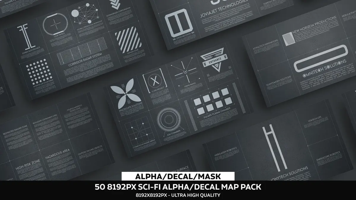 - 50 Unique Decal/Alpha Maps: This pack includes 50 unique sci-fi decal/alpha maps, each designed with intricate details, perfect for enhancing your models and environments.