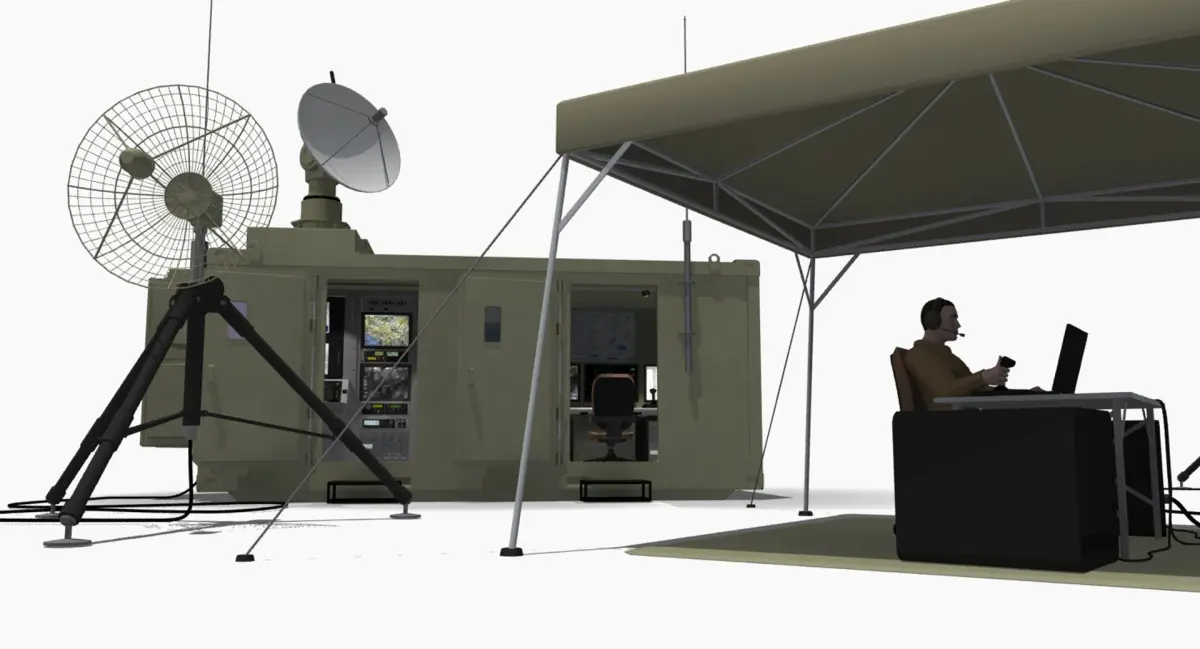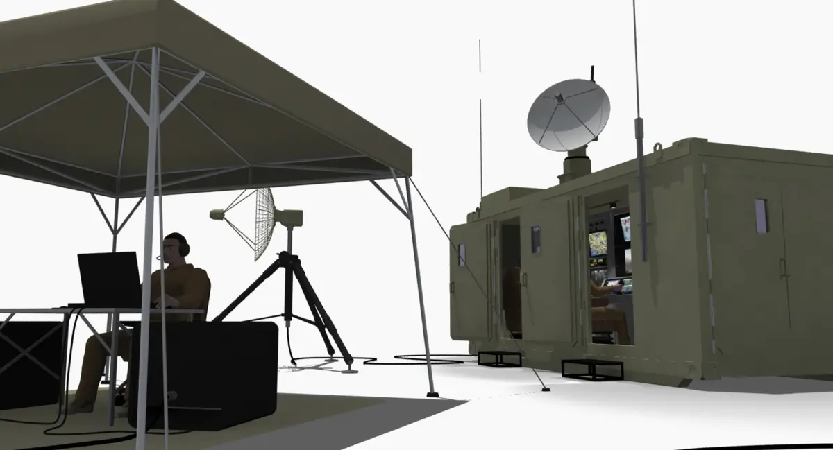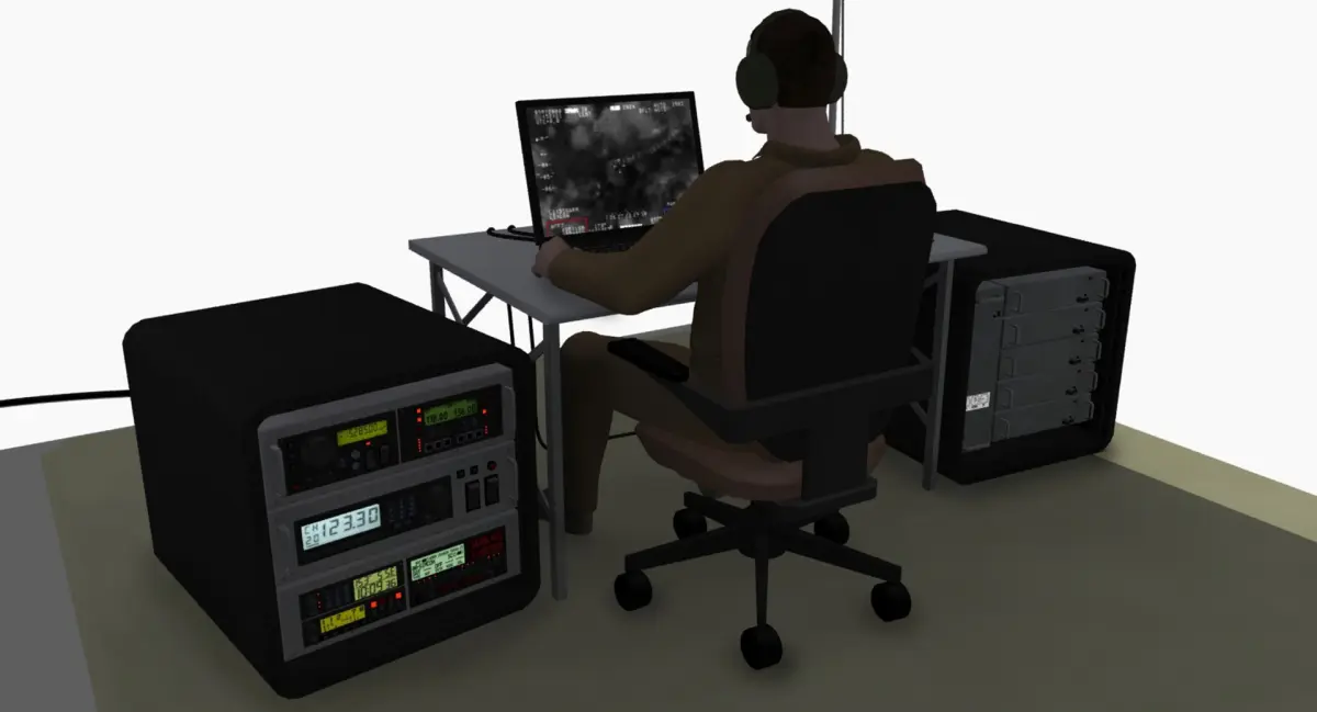 This is a UAV mobile ground control station with pilot and internal consoles, and an outside ground control station setup (under pop-up tent canopy). Control joystick and throttle sticks are designed to move. Individual switches, buttons, and LCD displays are modeled on the control panels. Hard-mount tracking antenna on top of mobile unit is designed with fully articulating joints. Ground tripod tracking antennas also have fully articulating heads to follow aircraft, and tripod legs fold up/collapse. Human pilot models are overlap-ball-jointed so all limbs can be articulated without the need for rigging.