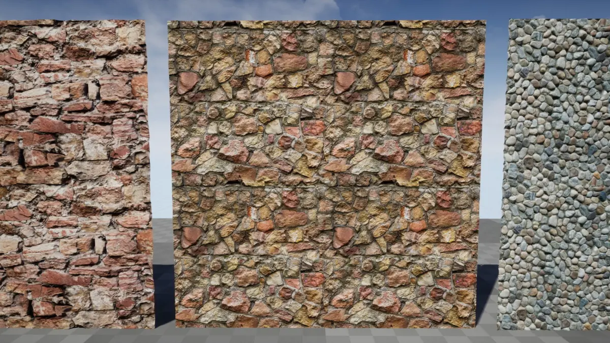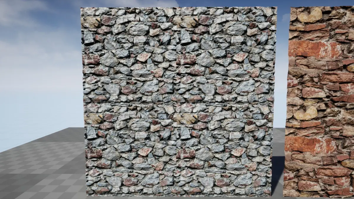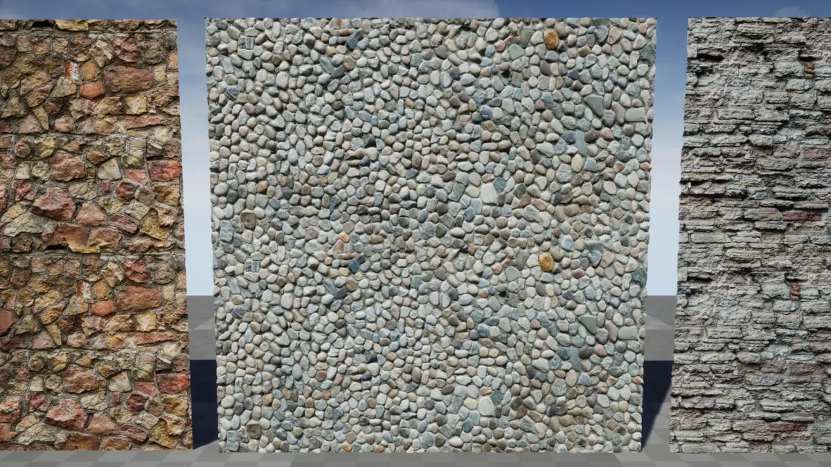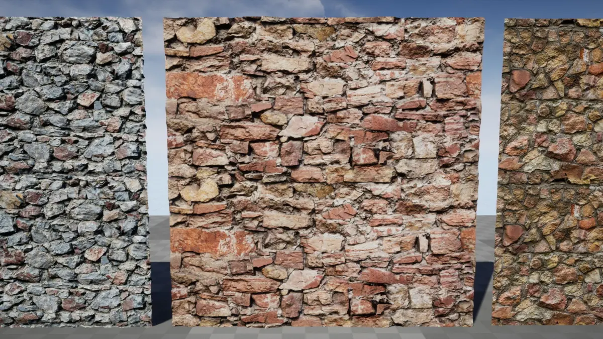 Materials have a displacement map based on real world data (photogrammetry method), which gives the surfaces a realistic volume and texture. Stone masonry of various shapes, colors and sizes.