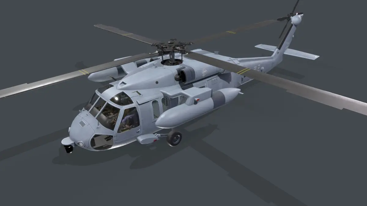- Asset model has 16 objects (interior, fuselage, glass, lights, rotors, camera)
