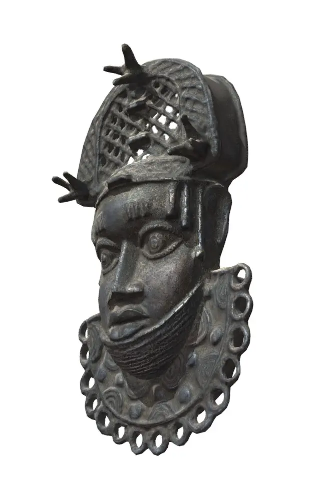 Uhunmwu-Ẹkuẹ (pendant masks) is a general term, with each mask having a specific name based on the subject it depicts. These masks are among the most renowned Benin artworks and depict a variety of human and animal heads, often worn on the belt or hip. The material and iconography determined who could wear them: warriors wore leopard-head masks, high-ranking officials wore ivory masks, and the Ọba wore brass crocodile-head masks. While most masks depict male faces, including Portuguese men reflecting historical ties, the Queen Idia masks, carved in ivory, are a notable exception.