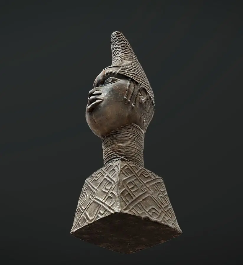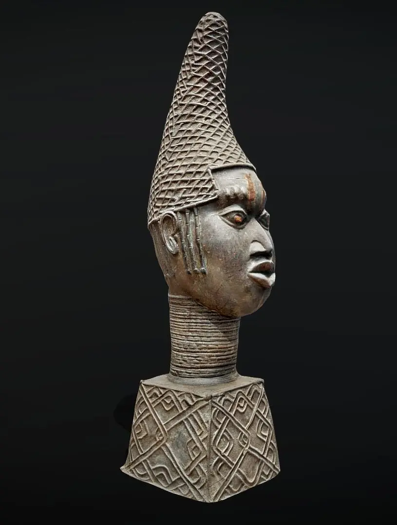 Commemorative Queen Mother Head Unique bronze cast Edo Queens head. It commemorates Queen Idia, the mother of Oba Esigie, who reigned between 1504 and 1550. She earned her own palace as a reward for utilizing her mystical powers to secure victory in Benin’s war against the Igala people. The bronze head showcases a naturalistic, almost life-size portrayal of Queen Idia with an elegant conical hairstyle adorned with an intricate openwork coral bead net. Long strands of coral beads drape gracefully at the sides and back, while she wears a high coral bead collar. Notably, there are two vertical marks on her forehead originally inset withron and four scarification marks above each eye. The pupils are beautifully inlaid with iron. Overall, this exceptional sculpture captures the regal essence of Queen Idia, commemorating her pivotal role in Benin’s history and her remarkable accomplishments during her son’s reign.