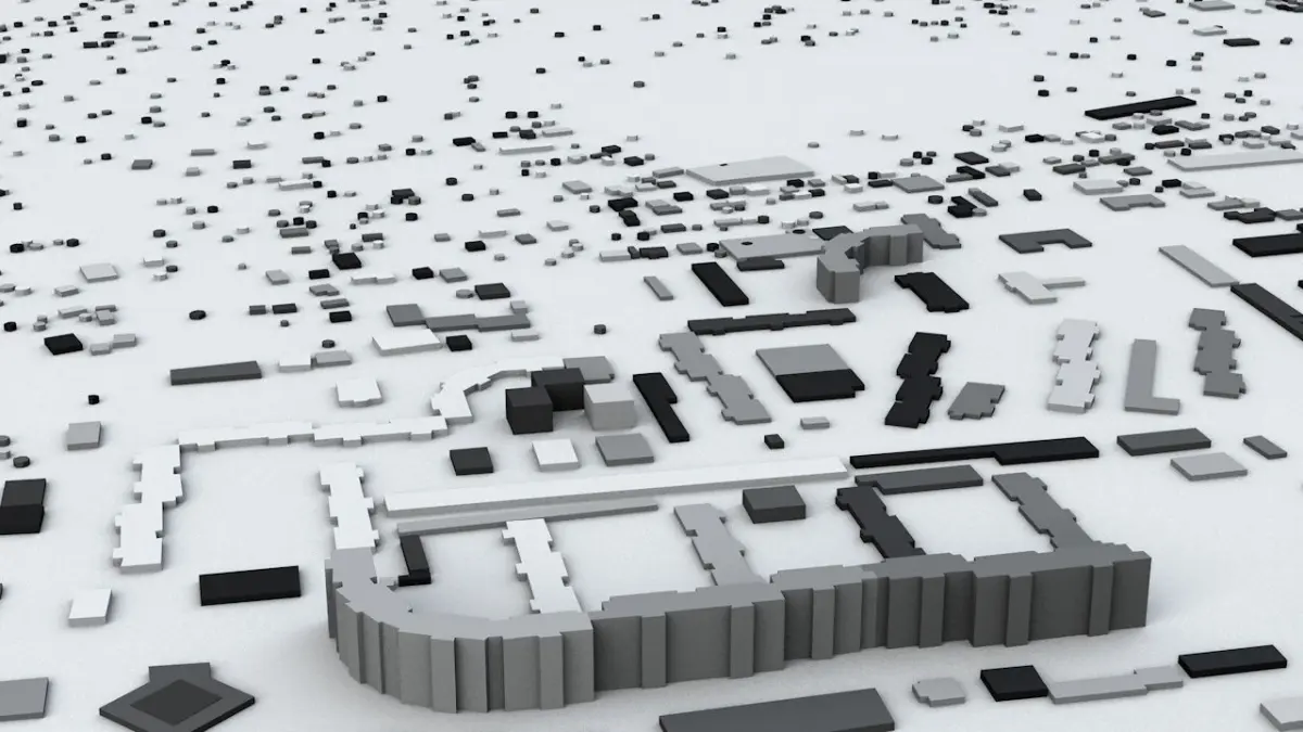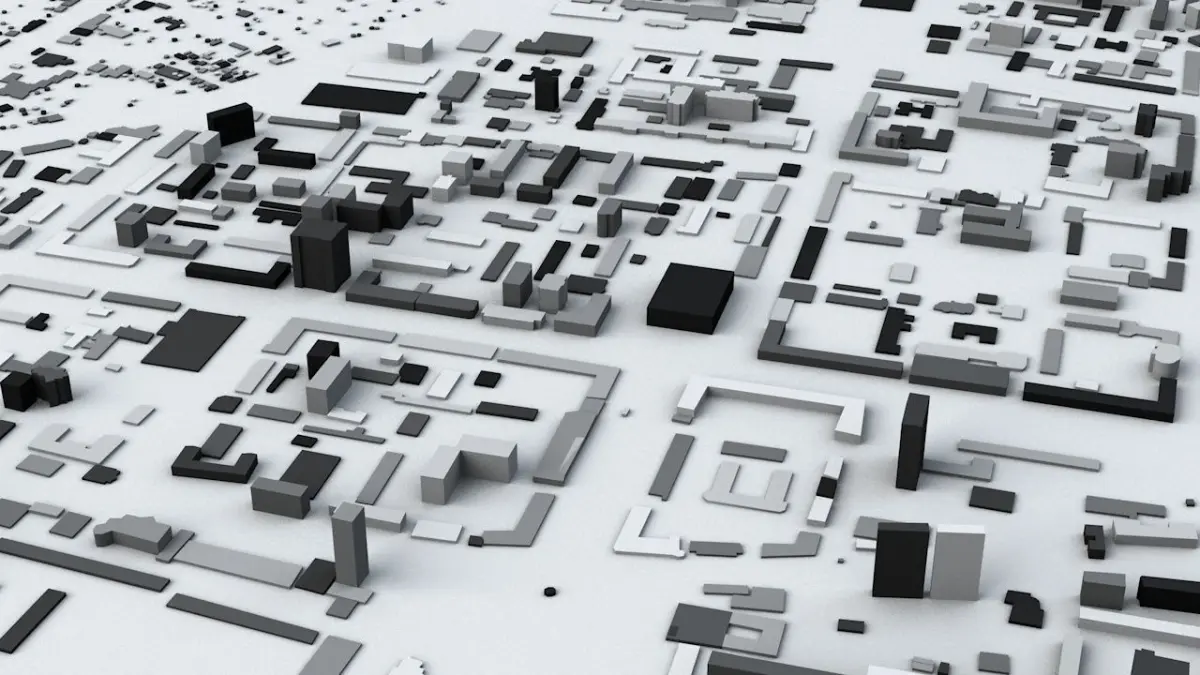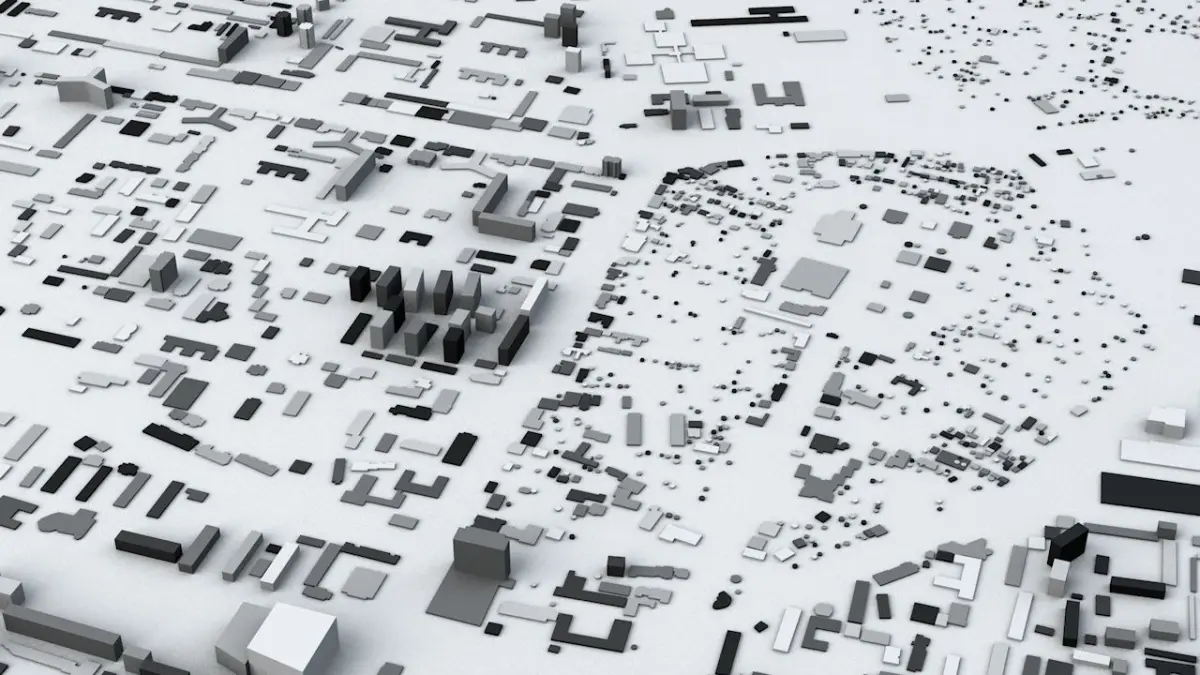 - the model is positioned on a flat surface (all buildings are on the “floor” - no elevation data included)