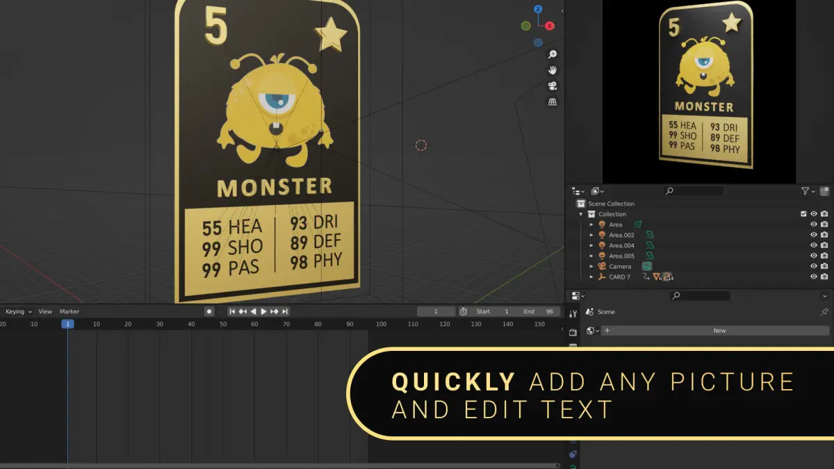 3D Sports Card template for editing a Blender.You can easily edit color, text and also add a photo of your football player or character.Using this template, you can create your NFT collection