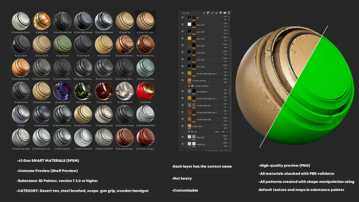 High-quality preview43 smart materials (spsm)Each layer has the correct nameNot heavyCustomizable100% made with substance painterAll materials checked with PBR validatorcompatible Substance 3D Painter, version 7.3.0 and highercustom shelf previewAll patterns created with shape manipulation using default texture and maps in substance painter