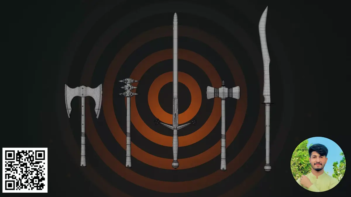This is a professional 3D collection featuring five iconic historical and fantasy melee weapons: a Double-Headed Battle Axe, a Spiked Mace, a Two-Handed Longsword, a Heavy War Hammer, and a curved Fantasy Scimitar. Each weapon is designed with a realistic, weathered aesthetic, making them perfect for high-end RPGs, historical simulations, and dark fantasy game environments.