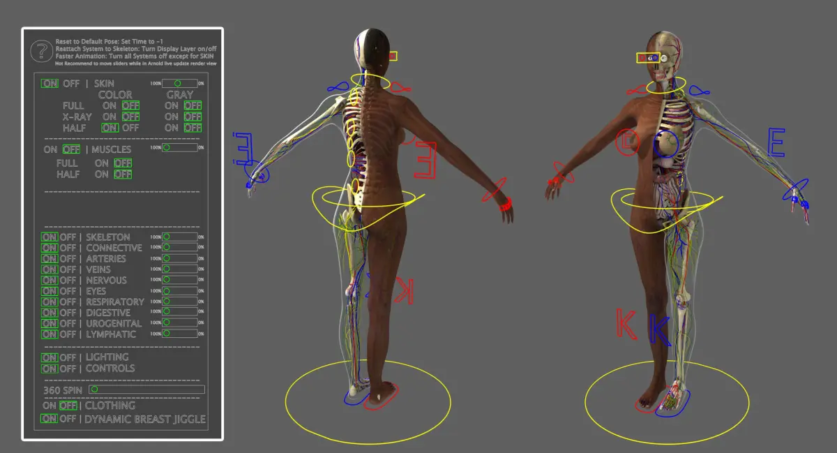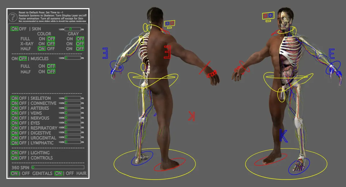 Full Body Rigged CharacterIncludes full body skeletal system with connective tissue, muscular system, circulatory system, nervous system, lymphatic system, digestive system, respiratory system, and urogenital system.