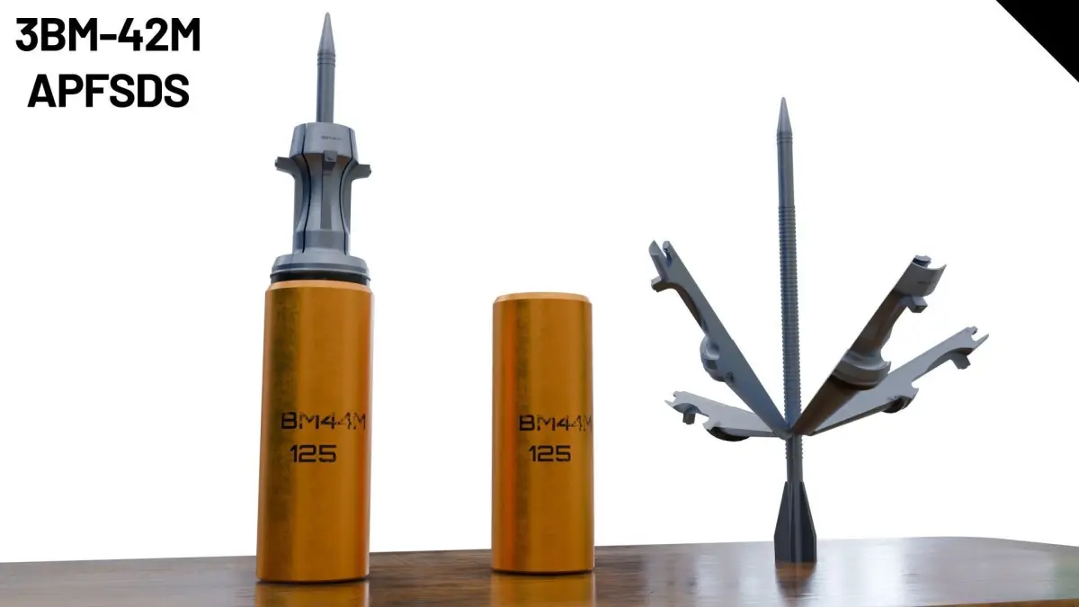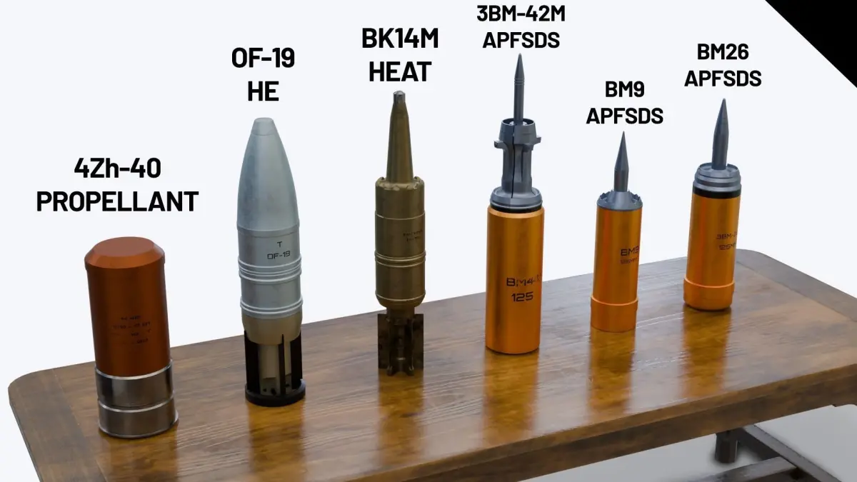 This is the Russian 125mm OF19 (ОФ19), a high-explosive fragmentation (HE-Frag), fin-stabilised projectile using the OF22 cartridge. In common with the rest of the 125mm ammunition range, the OF19 is a separate loading munition. It is automatically loaded into the breech followed by a semi-combustible propellant case.