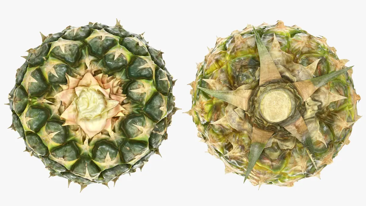 It is created using best practices, taking into account convenience of its further use in 3D scenes of various type. The shape and texture of pineapple fruit (body) were originally scanned from a real pineapple in a photogrammetry studio. Its crown was disassembled into individual leaves. Each individual leave was scanned from both sides using high-resolution 2D flatbed scanner and then recreated in geometry.