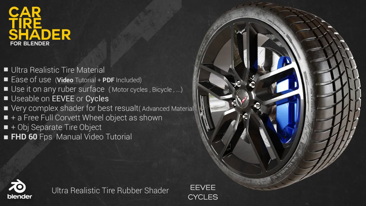 1.Ultra Realistic Tire Material 2.Ease of use (Video Tutorial + PDF Included) 3.Use it on any ruber surface ( Motor cycles , Bicycle , ...) 4.Useable on EEVEE or Cycles 5.Very complex shader for best resualt( Advanced Material ) 6.+ a Free Full Corvett Wheel object as shown 7.+ Obj Separate Tire Object 8.FHD 60 Fps Manual Video Tutorial 9.Created in blender 2.93