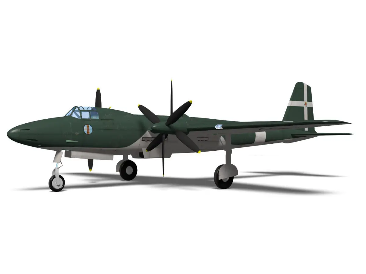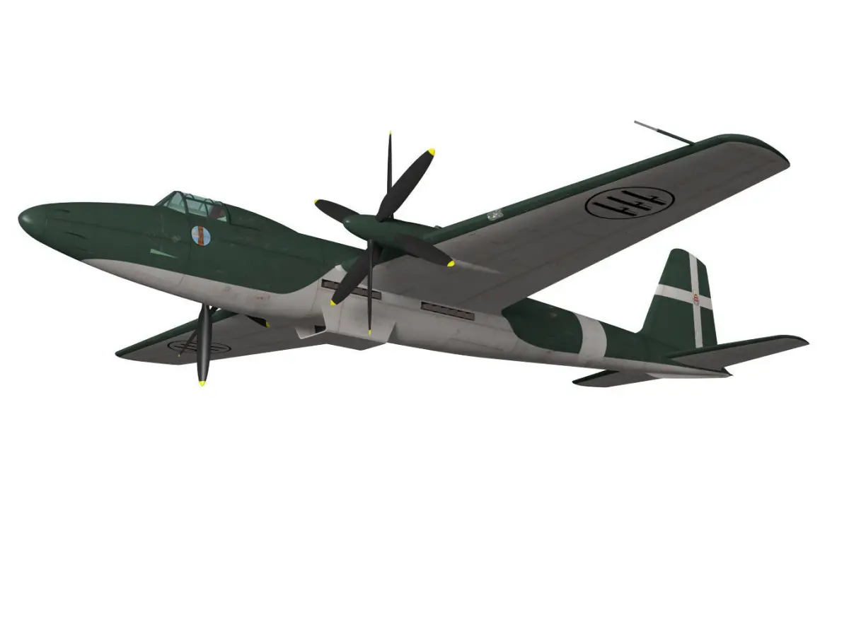 This twin-engine fighter was prototyped in Italy during WW2.It had a mechanism in which two engines were mounted longitudinally in the fuselage and an extended shaft was used to drive the double-reversing propellers on the wings.The project seems to have been cancelled without any test flights.The model is considered to be inaccurate as there are few documents available on the aircraft.