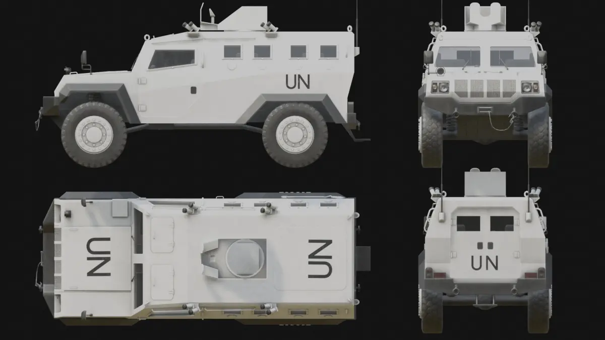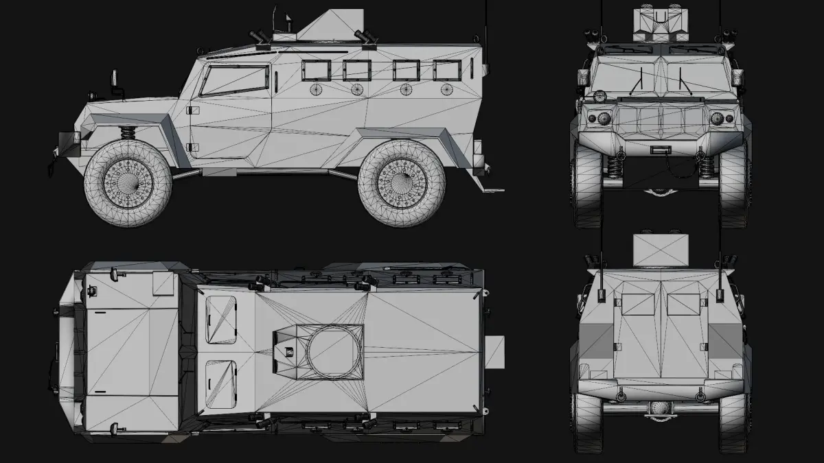 Moving parts like suspension, wheels, turret, steering wheel, doors, as well as transparent glass parts are separate objects. 35 objects in total.